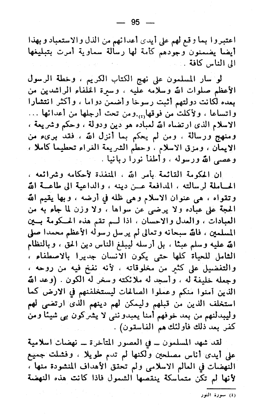 إن الحكومة القائمة بأمر الله، المنفذة لأحكامه وشرائعه، الحاملة لرسالته، المدافعة عن دينه، والداعية الى طاعة الله وتقواه، هي عنوان الاسلام وهى ظله في أرضه، وبها يقيم الله الحجة على عباده ولا يرضى عن سواها. ولا وزن لما جاء به من العبادات، والعدل والاحسان. اذا لم تقم هذه الحكومة بين المسلمين. فالله سبحانه وتعالى لم يرسل رسوله الأعظم محمدا صلى الله عليه وسلم عبثا، بل أرسله ليبلغ الناس دين الحق، وبالنظام الشامل للحياة كلها حتى يكون الانسان جديرا بالاصطفاء، والتفضيل على كثير من مخلوقاته. لأنه نفخ فيه من روحه، وجعله خليفة له، وأسجد له ملائكته وسخر له الكون. (وعد الله الذين آمنوا منكم وعملوا الصالحات ليستخلفنهم في الارض كما استخلف الذين من قبلهم وليمكنن لهم دينهم الذى ارتضى لهم وليبدلنهم من بعد خوفهم أمنا يعبدونني لا يشركون بي شيئا ومن كفر بعد ذلك فأولئك هم الفاسقون (.