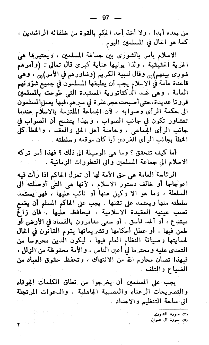 الاسلام يأمر بالشورى بين جماعة المسلمين، ويعتبرها هي الحرية الحقيقية، ولذا يوليها عناية كبرى قال تعالى: (وأمرهم شورى بينهم) (¬1) وقال لنبيه الكريم (وشاورهم في الأمر) (¬2)، وهي قاعدة عامة في الاسلام يجب أن يطبقها المسلمون في جميع شؤونهم العامة، وهى ضد الدكتاتورية المستبدة التي طوحت بالمسلمين قرونا عديدة، حتى أصبحت حجر عثرة في سيرهم، فبها يصل المسلمون الى حكمة الرأي وصوابه، لأن الجماعة الملتزمة بالإسلام عندما تتشاور تكون في جانب الصواب، وبهذا يتضح أن الصواب في جانب الرأي الجماعي، وخاصة أهل الحل والعقد، والخطأ كل الخطأ بجانب الرأي الفردي أيا كان موقعه وسلطته.