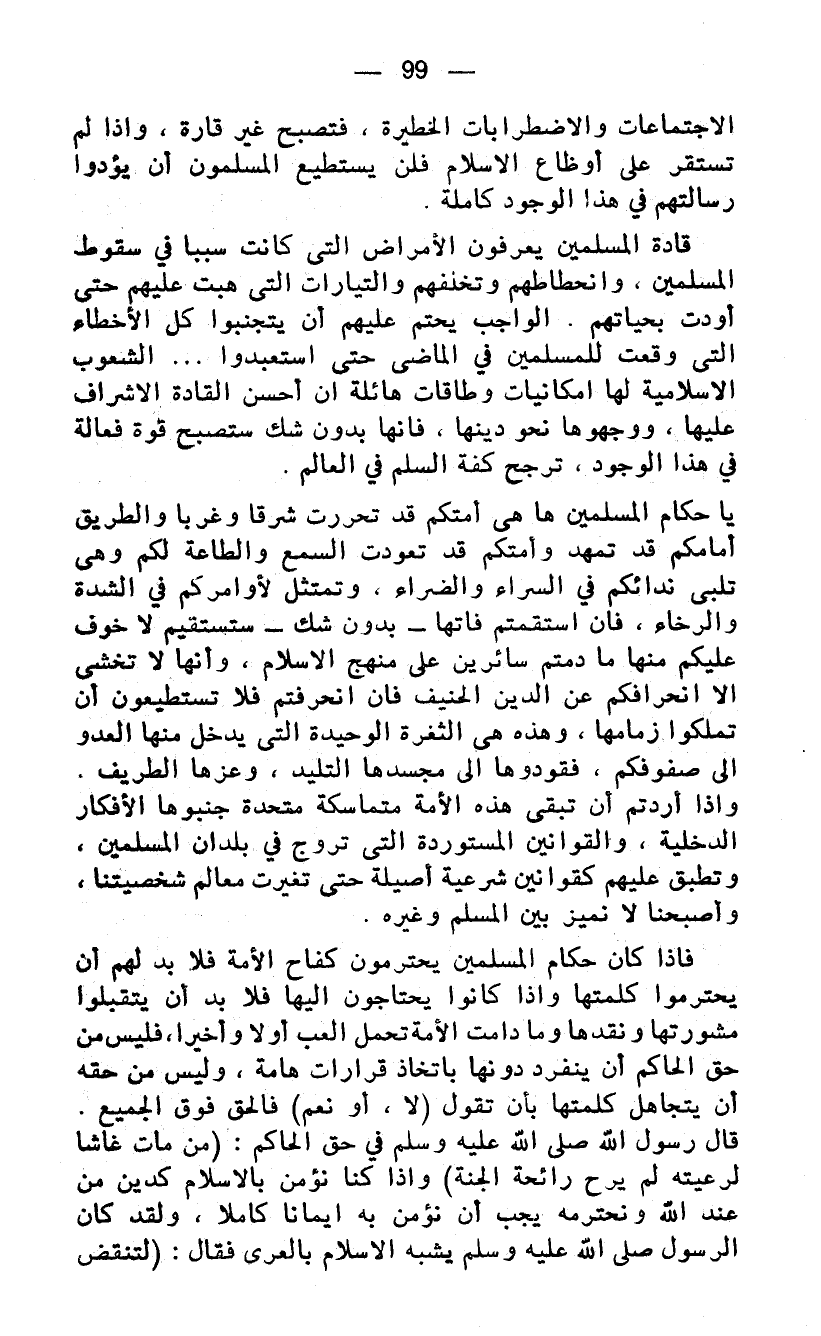 يا حكام المسلمين ها هي أمتكم قد تحررت شرقا وغربا والطريق أمامكم قد تمهد وأمتكم قد تعودت السمع والطاعة لكم وهي تلبي ندائكم في السراء والضراء، وتمتثل لأوامركم في الشدة والرخاء، فإن استقمتم فإنها - بدون شك - ستستقيم لا خوف عليكم منها ما دمتم سائرين على منهج الاسلام، وأنها لا تخشى الا انحرافكم عن الدين الحنيف فإن انحرفتم فلا تستطيعون أن تملكوا زمامها، وهذه هي الثغرة الوحيدة التي يدخل منها العدو الى صفوفكم، فقودوها الى مجدها التليد، وعزها الطريف، وإذا أردتم أن تبقى هذه الأمة متماسكة متحدة جنبوها الأفكار الدخيلة، والقوانين المستوردة التي تروج في بلدان المسلمين، وتطبق عليهم كقوانين شرعية أصيلة حتى تغيرت معالم شخصيتنا، وأصبحنا لا نميز بين المسلم وغيره.