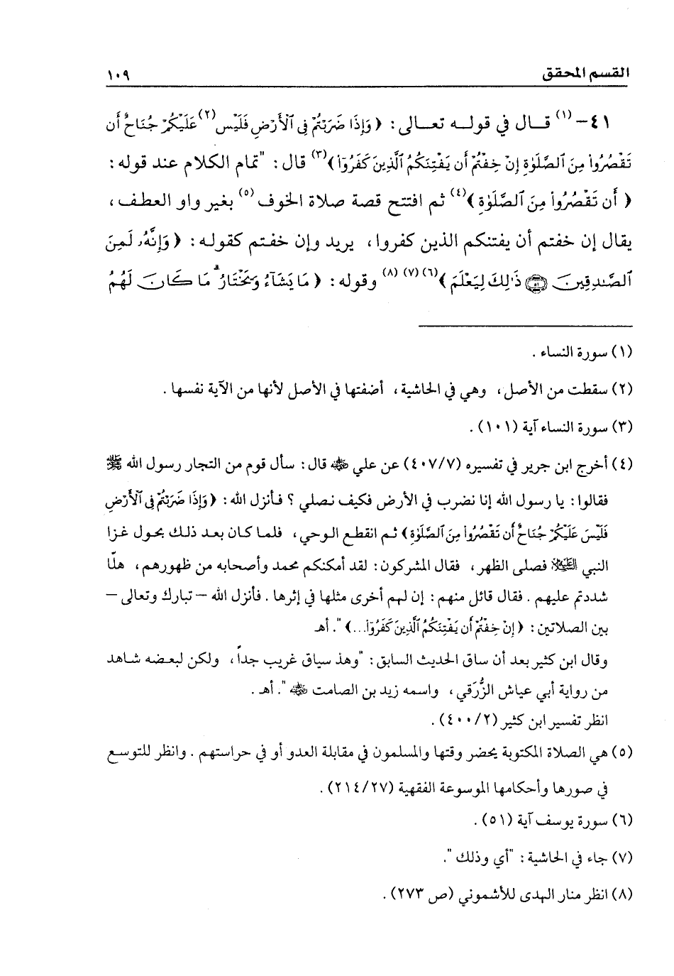 41 - قال في قوله تعالى: {وَإِذَا ضَرَبْتُمْ فِي الْأَرْضِ فَلَيْسَ عَلَيْكُمْ جُنَاحٌ أَنْ تَقْصُرُوا مِنَ الصَّلَاةِ إِنْ خِفْتُمْ أَنْ يَفْتِنَكُمُ الَّذِينَ كَفَرُوا} قال: " تمام الكلام عند قوله: {أَنْ تَقْصُرُوا مِنَ الصَّلَاةِ} ثم افتتح قصة صلاة الخوف بغير واو العطف، بفال إن خفتم أن يفتنكم الذين كفروا، يريد وإن خفتم كقوله: {وَإِنَّهُ لَمِنَ الصَّادِقِينَ (51) ذَلِكَ لِيَعْلَمَ} وقوله: {مَا يَشَاءُ وَيَخْتَارُ مَا كَانَ لَهُمُ الْخِيَرَةُ}.