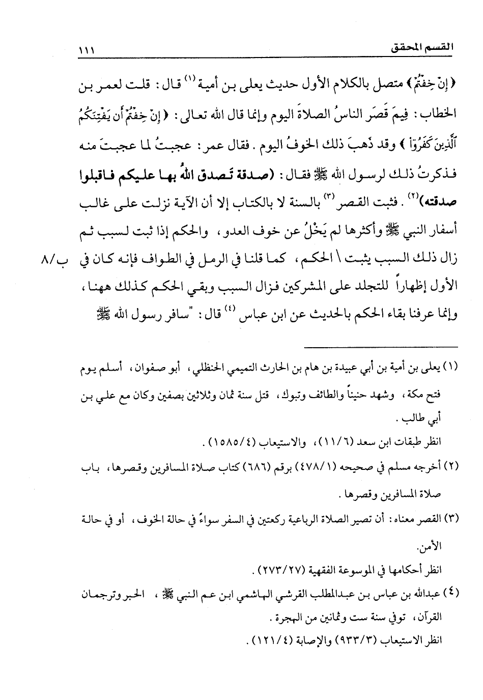 {إِنْ خِفْتُمْ} متصل بالكلام الأول حديث يعلى بن أمية قال: قلت لعمر بن الخطاب: فِيمَ قَصَر الناسُ الصلاةَ اليوم وإنما قال الله تعالى: {إِنْ خِفْتُمْ أَنْ يَفْتِنَكُمُ الَّذِينَ كَفَرُوا} وقد ذهبَ ذلك الخوفُ اليوم. فقال عمر: عجبتُ لما عجبتَ منه فذكرتُ ذلك لرسول الله - صلى الله عليه وسلم - فقال: (صدقة تَصدق الله بها عليكم فاقبلوا صدقته). فثبت القصر بالسنة لا بالكتاب إلا أن الآية نزلت على غالب أسفار النبي - صلى الله عليه وسلم - وأكثرها لم يَخْلُ عن خوف العدو، والحكم إذا ثبت لسبب ثم زال ذلك السبب يثبت الحكم، كما قلنا في الرمل في الطواف فإنه كان في الأول إظهاراً للتجلد على المشركين فزال السبب وبقي الحكم كذلك ههنا، وإنما عرفنا بقاء الحكم بالحديث عن ابن عباس قال: " سافر رسول الله - صلى الله عليه وسلم -