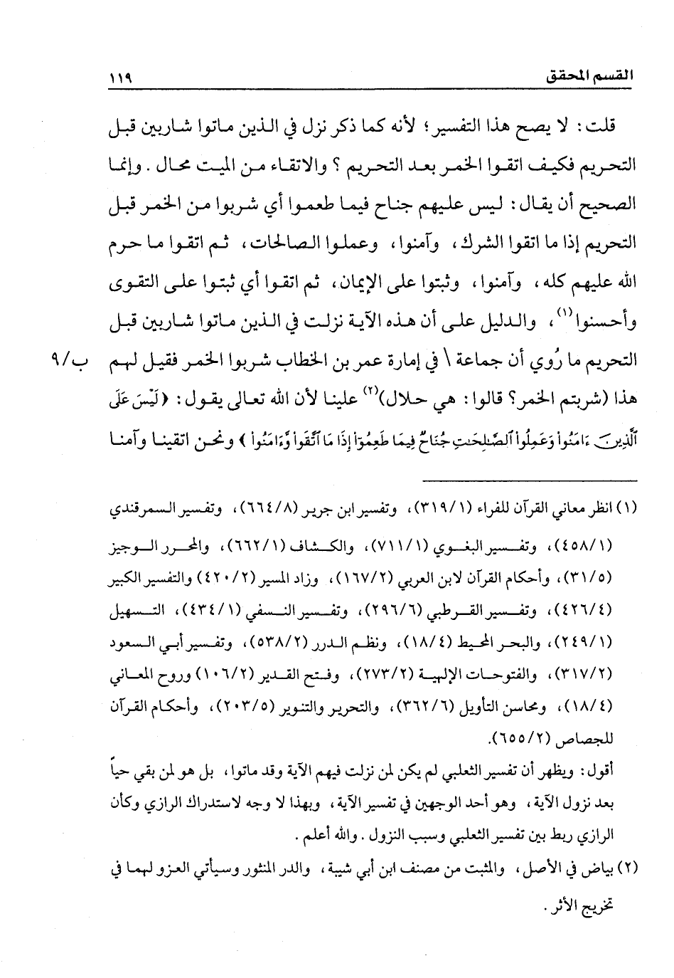قلت: لا يصح هذا التفسير؛ لأنه كما ذكر نزل في الذين ماتوا شاربين قبل التحريم فكيف اتقوا الخمر بعد التحريم؟ والاتقاء من الميت محال. وإنما الصحيح أن يقال: ليس عليهم جناح فيما طعموا أي شربوا من الخمر قبل التحريم إذا ما اتقوا الشرك، وآمنوا، وعملوا الصالحات، ثم اتقوا ما حرم الله عليهم كله، وآمنوا، وثبتوا على الإيمان، ثم اتقوا أي ثبتوا على التقوى وأحسنوا، والدليل على أن هذه الآية نزلت في الذين ماتوا شاريين قبل التحريم ما رُوي أن جماعة في إمارة عمر بن الخطاب شربوا الخمر فقيل لهم هذا (شربتم الخمر؟ قالوا: هي حلال) علينا لأن الله تعالى يقول: (لَيْسَ عَلَى الَّذِينَ آمَنُوا وَعَمِلُوا الصَّالِحَاتِ جُنَاحٌ فِيمَا طَعِمُوا إِذَا مَا اتَّقَوْا وَآمَنُوا) ونحن اتقينا وآمنا