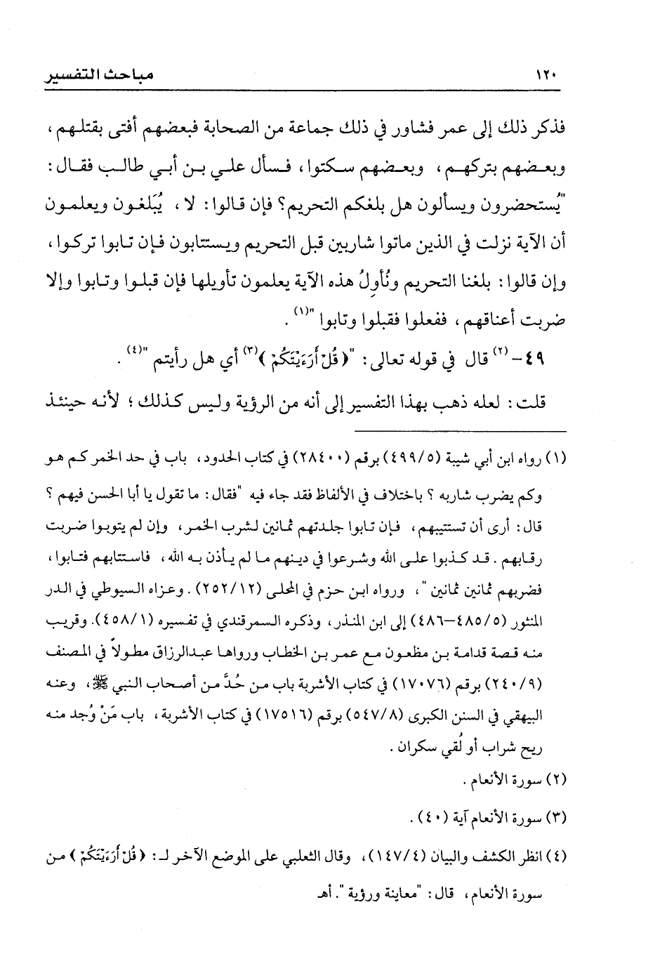 فذكر ذلك إلى عمر فشاور في ذلك جماعة من الصحابة فبعضهم أفتى بقتلهم، وبعضهم بتركهم، وبعضهم سكتوا، فسأل علي بن أبي طالب فقال: " يُستحضرون ويسألون هل بلغكم التحريم؟ فإن قالوا: لا، يُبَلغون ويعلمون أن الآية نزلت في الذين ماتوا شاربين قبل التحريم ويستتابون فإن تابوا تركوا، وإن قالوا: بلغنا التحريم ونُأوِلُ هذه الآية يعلمون تأويلها فإن قبلوا وتابوا وإلا ضربت أعناقهم، ففعلوا فقبلوا وتابوا.