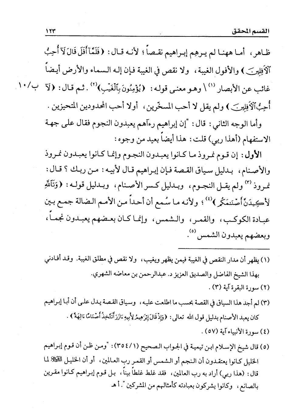 الأول: إن قوم نمروذ ما كانوا يعبدون النجوم وإنما كانوا يعبدون نمروذ والأصنام، بدليل سياق القصة فإن إبراهيم قال لأبيه: من ربك؟ قال: نمروذ ولم يقل النجوم، وبدليل كسر الأصنام، وبدليل قوله: {وَتَاللَّهِ لَأَكِيدَنَّ أَصْنَامَكُمْ}؛ ولأنه ما سُمع أن أحداً من الأمم الضالة جمع بين عبادة الكوكب، والقمر، والشمس، وإنما كان بعضهم يعبدون نجماً، وبعضهم يعبدون الشمس.