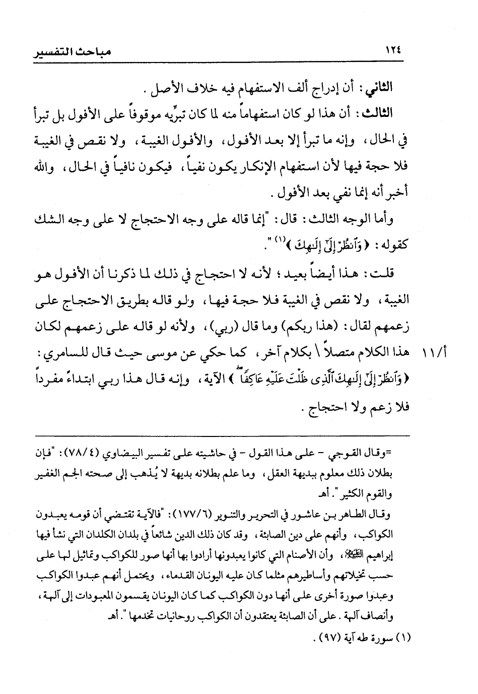 الثالث: أن هذا لو كان استفهاماً منه لما كان تبرِّيه موقوفاً على الأفول بل تبرأ في الحال، وإنه ما تبرأ إلا بعد الأفول، والأفول الغيبة، ولا نقص في الغيبة فلا حجة فيها لأن استفهام الإنكار يكون نفياً، فيكون نافياً في الحال، والله أخبر أنه إنما نفي بعد الأفول.