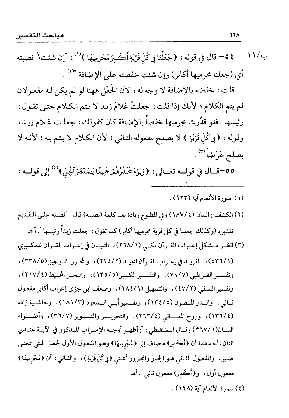 54 - قال في قوله: {وَكَذَلِكَ جَعَلْنَا فِي كُلِّ قَرْيَةٍ أَكَابِرَ مُجْرِمِيهَا}: " إن شئت نصبته أي (جعلنا مجرميها أكابر) وإن شئت خفضته على الإضافة ".
