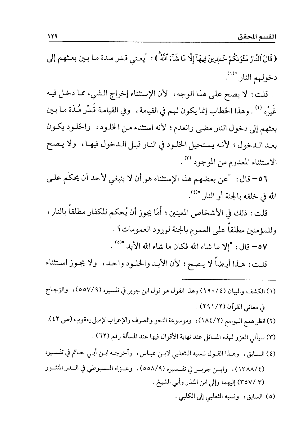 56 - قال: " عن بعضهم هذا الاستثناء هو أن لا ينبغي لأحد أن يحكم على الله في خلقه بالجنة أو النار ".