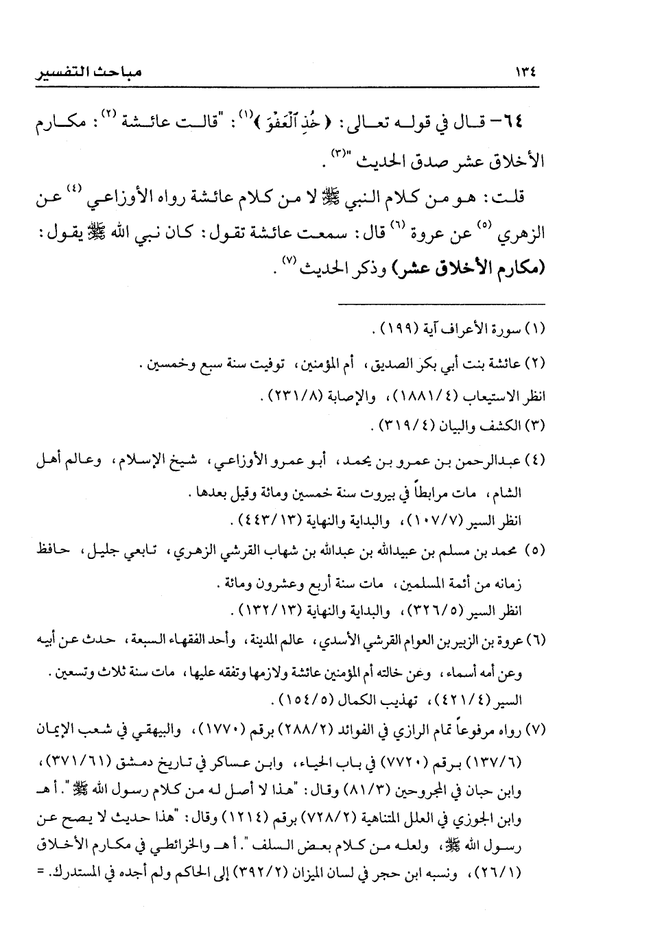 64 - قال في قوله تعالى: {خُذِ الْعَفْوَ وَأْمُرْ بِالْعُرْفِ وَأَعْرِضْ عَنِ الْجَاهِلِينَ}: " قالت عائشة: مكارم الأخلاق عشر صدق الحديث "