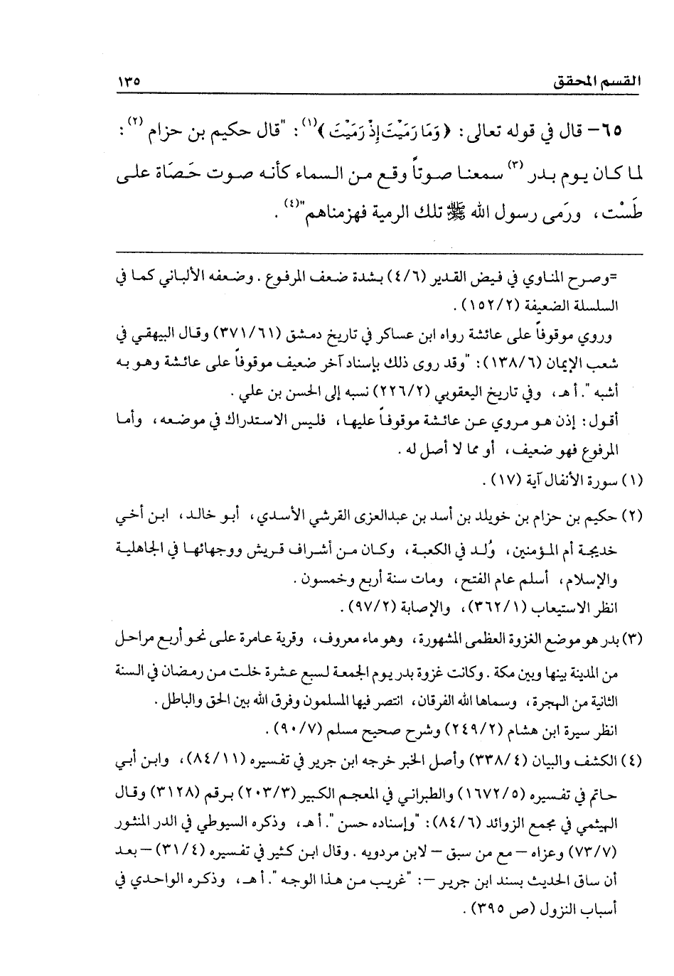 65 - قال في قوله تعالى: {وَمَا رَمَيتَ إِذ رَمَيتَ}: " قال حكيم بن حزام: لما كان يوم بدر سمعنا صوتاً وقع من السماء كأنه صوت حَصَاة على طَسْت، ورَمى رسول الله - صلى الله عليه وسلم - تلك الرمية فهزمناهم ".