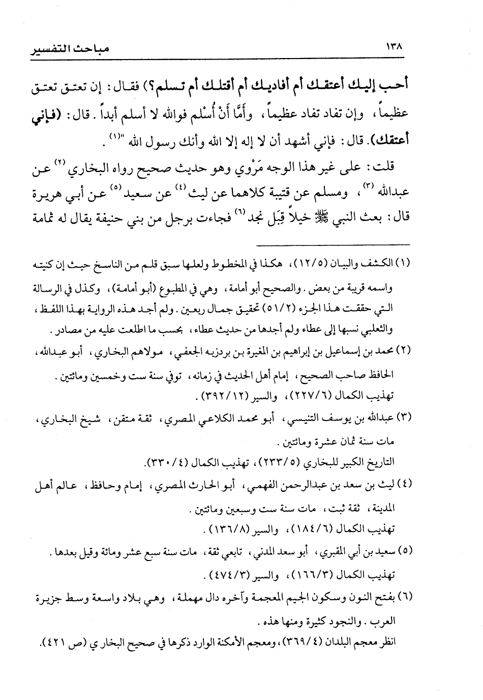أحب إليك أعتقك أم أفاديك أم أقتلك أم تسلم؟) فقال: إن تعتق تعتق عظيماً، وإن تفاد تفاد عظيماً، وأَمَّا أَنْ أُسْلم فوالله لا أسلم أبداً. قال: (فإني أعتقك). قال: فإني أشهد أن لا إله إلا الله وأنك رسول الله ".