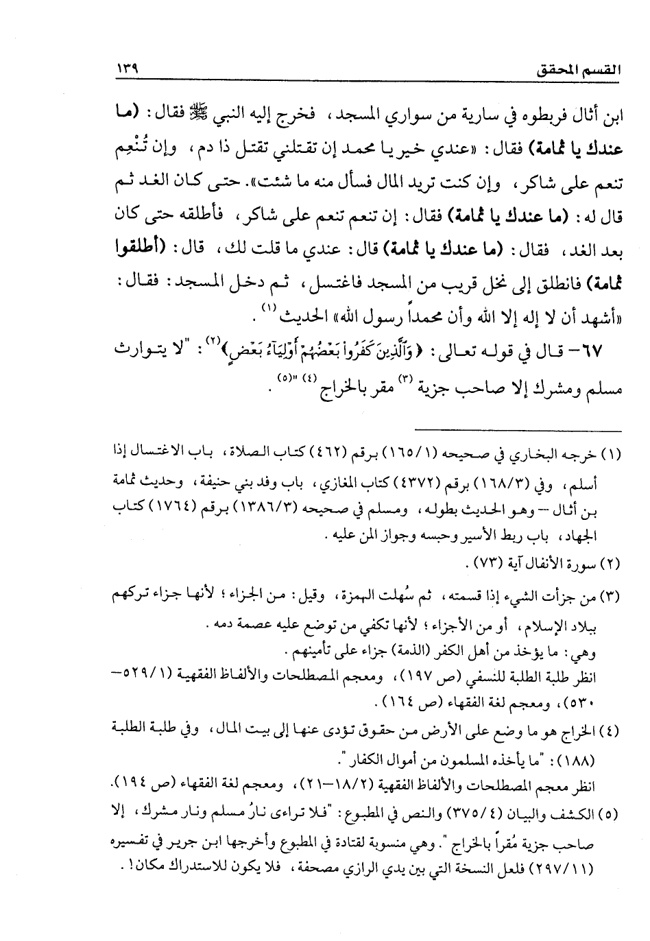 ابن أثال فربطوه في سارية من سواري المسجد، فخرج إليه النبي - صلى الله عليه وسلم - فقال: (ما عندك يا ثمامة) فقال: " عندي خير يا محمد إن تقتلني تقتل ذا دم، وإن تُنْعِم تنعم على شاكر، وإن كنت تريد المال فسأل منه ما شئت ". حتى كان الغد ثم قال له: (ما عندك يا ثمامة) فقال: إن تنعم تنعم على شاكر، فأطلقه حتى كان بعد الغد، فقال: (ما عندك يا ثمامة) قال: عندي ما قلت لك، قال: (أطلقوا ثمامة) فانطلق إلى نخل قريب من المسجد فاغتسل، ثم دخل المسجد: فقال: " أشهد أن لا إله إلا الله وأن محمداً رسول الله " الحديث.