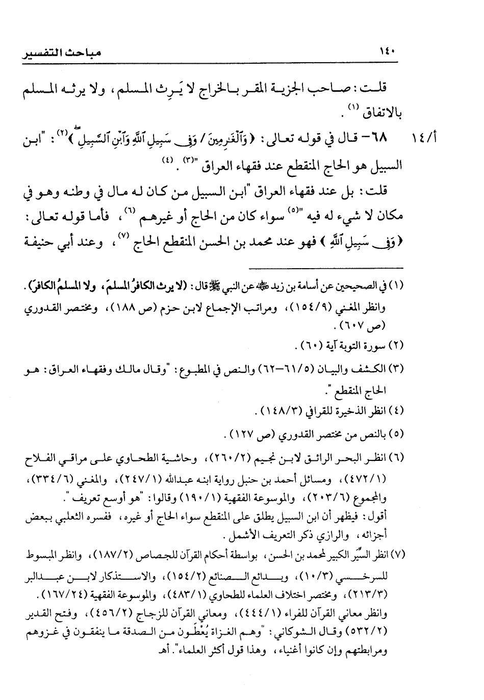 قلت: بل عند فقهاء العراق " ابن السبيل من كان له مال في وطنه وهو في مكان لا شيء له فيه " سواء كان من الحاج أو غيرهم، فأمَّا قوله تعالى: {وَفي سَبِيلِ اللَّهِ} فهو عند محمد بن الحسن المنقطع الحاج، وعند أبي حنيفة