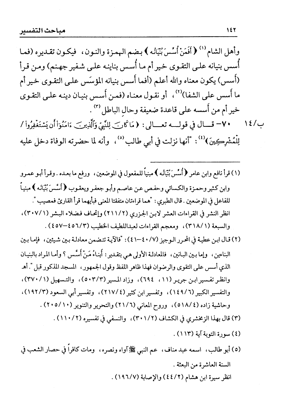 70 - قال في قوله تعالى: {مَا كَانَ لِلنَّبِيِّ وَالَّذِينَ آمَنُوا أَنْ يَسْتَغْفِرُوا لِلْمُشْرِكِينَ وَلَوْ كَانُوا أُولِي قُرْبَى}: " أنها نزلت في أبي طالب، وأنه لما حضرته الوفاة دخل عليه
