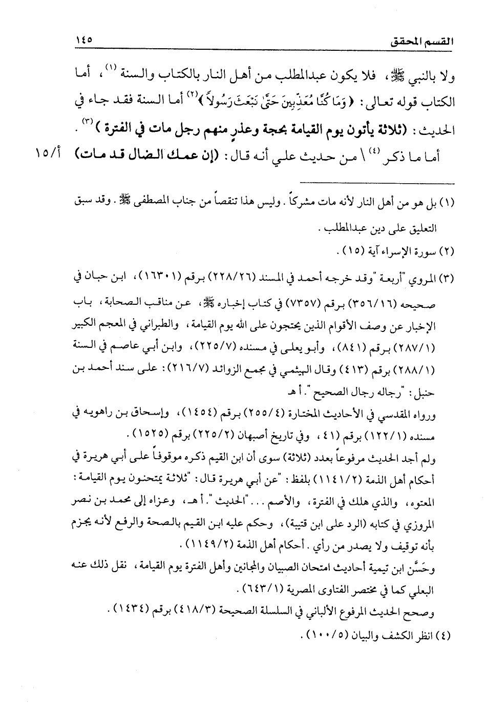 ولا بالنبي - صلى الله عليه وسلم -، فلا يكون عبد المطلب من أهل النار بالكتاب والسنة، أما الكتاب قوله تعالى: {وَمَا كُنَّا مُعَذِّبِينَ حَتَّى نَبْعَثَ رَسُولًا} أما السنة فقد جاء في الحديث: (ثلاثة يأتون يوم القيامة بحجة وعذرٍ منهم رجل مات في الفترة).