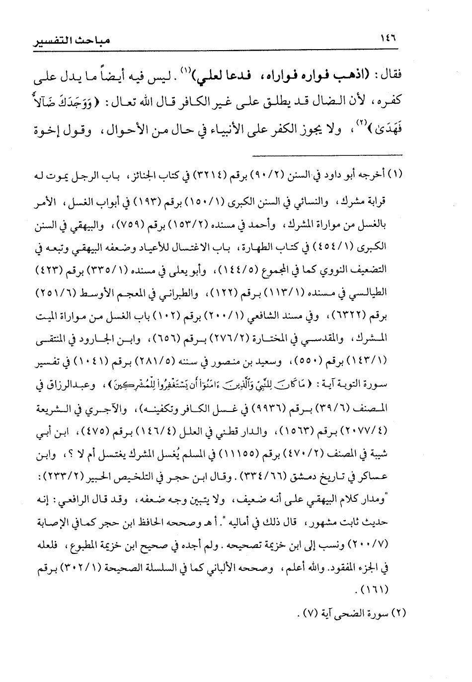 فقال: (اذهب فواره فواراه، فدعا لعلي). ليس فيه أيضاً ما يدل على كفره، لأن الضال قد يطلق على غير الكافر قال الله تعالى: {وَوَجَدَكَ ضَالًّا فَهَدَى}، ولا يجوز الكفر على الأنبياء في حال من الأحوال، وقول إخوة