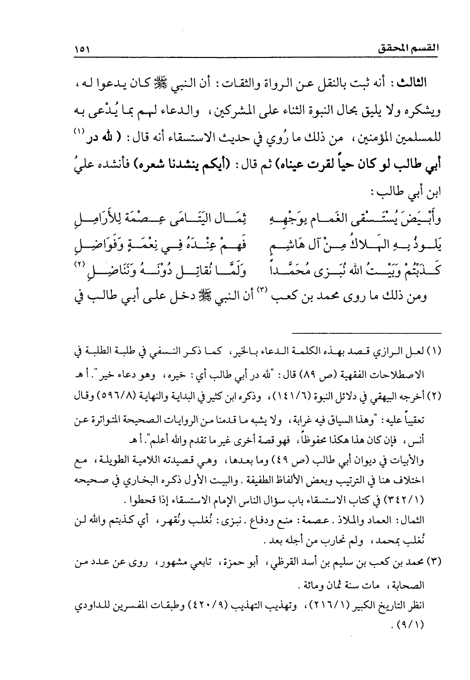 الثالث: أنه ثبت بالنقل عن الرواة والثقات: أن النبي - صلى الله عليه وسلم - كان يدعوا له، ويشكره ولا يليق بحال النبوة الثناء على المشركين، والدعاء لهم بما يُدْعى به للمسلمين المؤمنين، من ذلك ما رُوي في حديث الاستسقاء أنه قال: (لله در أبي طالب لو كان حياً لقرت عيناه) ثم قال: (أيكم ينشدنا شعره) فأنشده عليُ ابن أبي طالب: