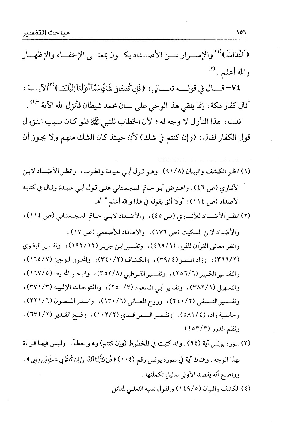 74 - قال في قوله تعالى: {فَإِنْ كُنْتَ فِي شَكٍّ مِمَّا أَنْزَلْنَا إِلَيْكَ} الآية: " قال كفار مكة: إنما يلقي هذا الوحي على لسان محمد شيطان فأنزل الله الآية ".