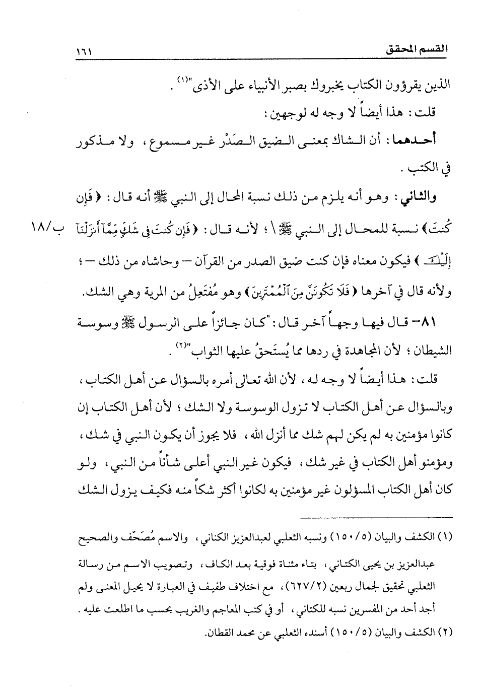 قلت: هذا أيضاً لا وجه له، لأن الله تعالى أمره بالسؤال عن أهل الكتاب، وبالسؤال عن أهل الكتاب لا تزول الوسوسة ولا الشك؛ لأن أهل الكتاب إن كانوا مؤمنين به لم يكن لهم شك مما أنزل الله، فلا يجوز أن يكون النبي في شك، ومؤمنو أهل الكتاب في غير شك، فيكون غير النبي أعلى شأناً من النبي، ولو كان أهل الكتاب المسؤلون غير مؤمنين به لكانوا أكثر شكاً منه فكيف يزول الشك