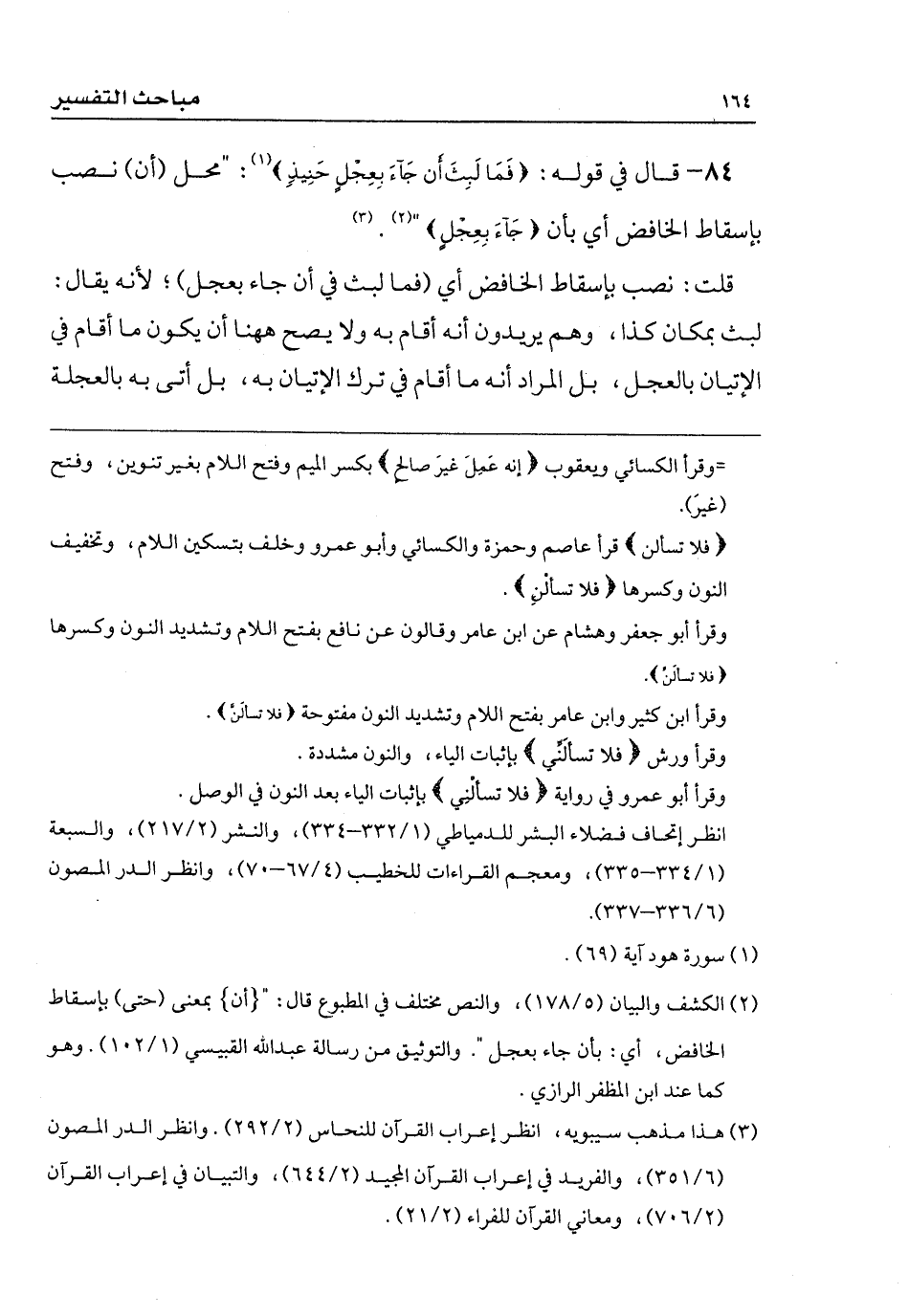 84 - قال في قوله: {فَمَا لَبِثَ أَنْ جَاءَ بِعِجْلٍ حَنِيذٍ}: " محل (أن) نصب بإسقاط الخافض أي بأن {جَاءَ بِعِجْلٍ}.