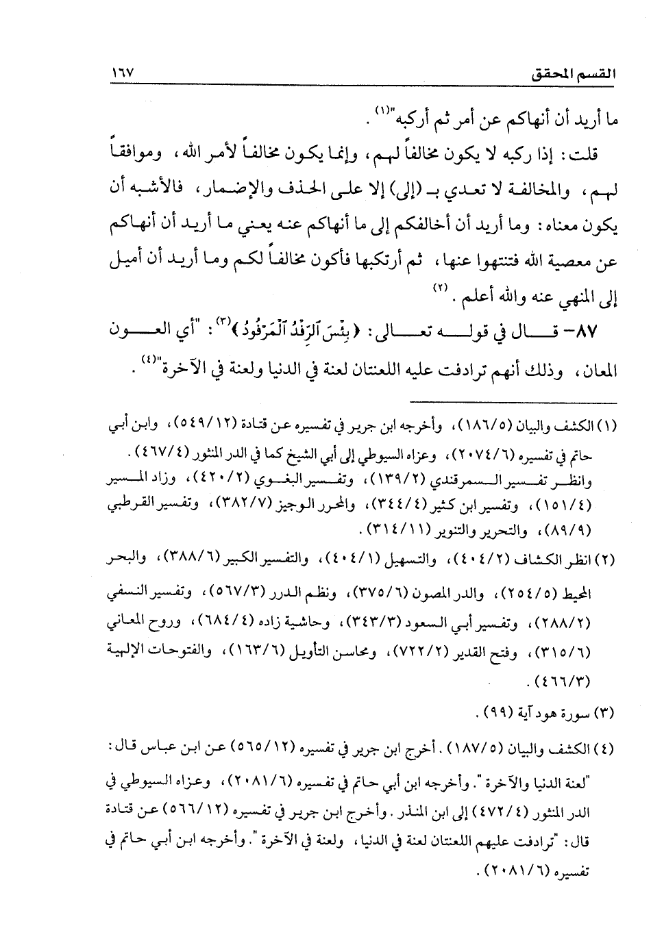 87 - قال في قوله تعالى: {بِئْسَ الرِّفْدُ الْمَرْفُودُ}: أي العون المعان، وذلك أنهم ترادفت عليه اللعنتان لعنة في الدنيا ولعنة في الآخرة ".