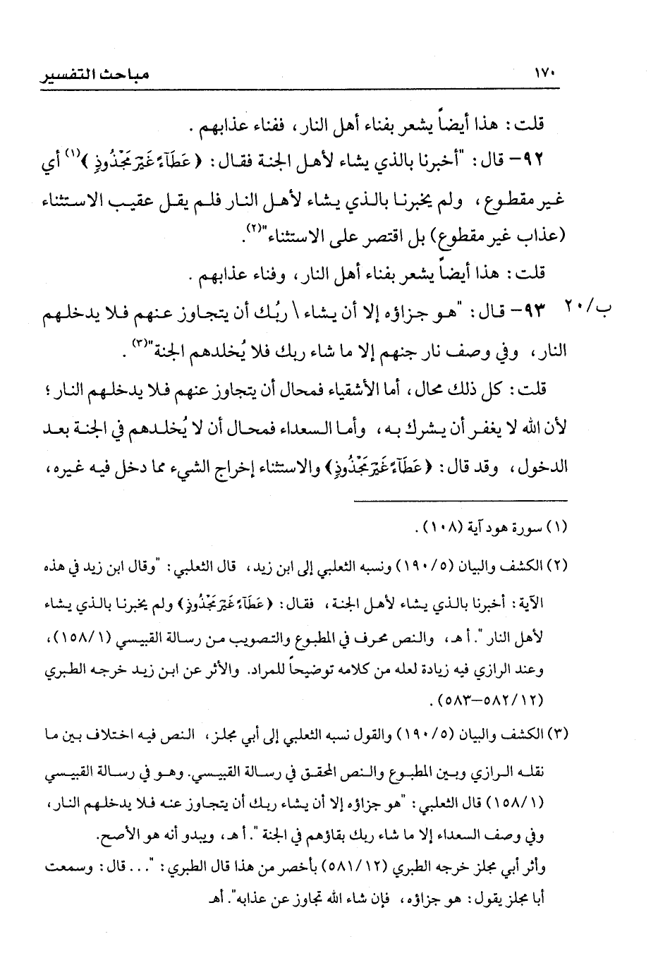 92 - قال: " أخبرنا بالذي يشاء لأهل الجنة فقال: {عَطَاءً غَيْرَ مَجْذُوذٍ} أي غيرمقطوع، ولم يخبرنا بالذي يشاء لأهل النار فلم يقل عقيب الاستثناء (عذاب غير مقطوع) بل اقتصر على الاستثناء ".