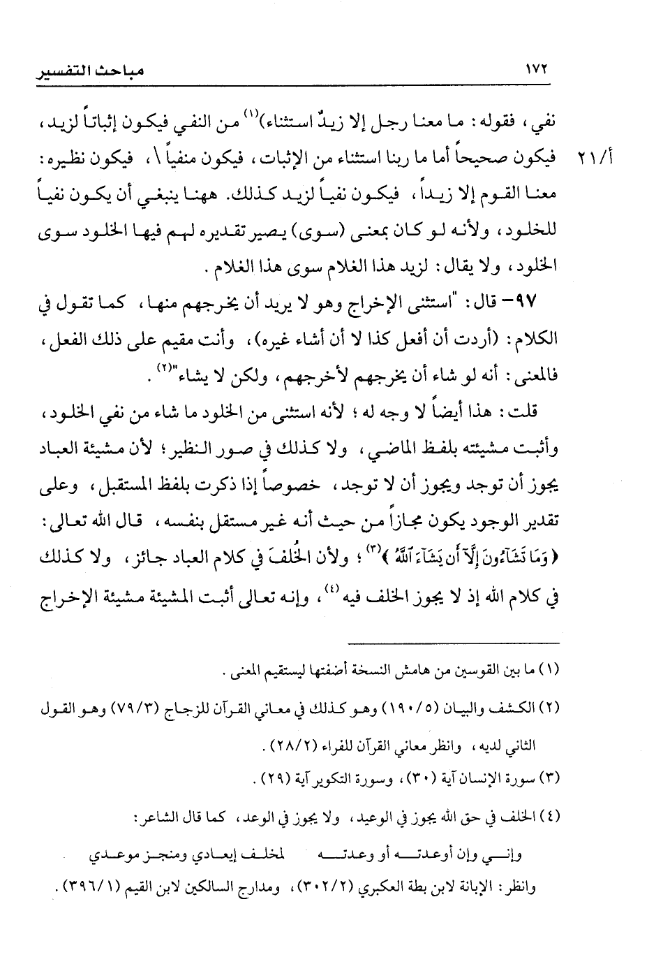 97 - قال: " استثنى الإخراج وهو لا يريد أن يخرجهم منها، كما تقول في الكلام: (أردت أن أفعل كذا إلا أن أشاء غيره)، وأنت مقيم على ذلك الفعل، فالمعنى: أنه لو شاء أن يخرجهم لأخرجهم، ولكن لا يشاء ".