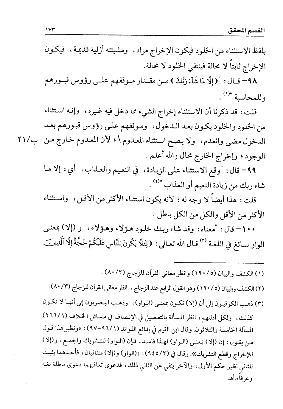 99 - قال: " وقع الاستثناء على الزيادة، في النعيم والعذاب، أي: إلا ما شاء ربك من زيادة النعيم أو العذاب ".