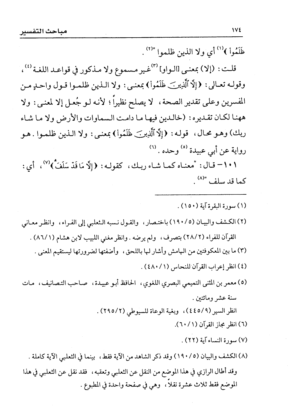 قلت: (إلا) بمعنى الواو غير مسموع ولا مذكور في قواعد اللغة، وقوله تعالى: {إِلَّا الَّذِينَ ظَلَمُوا} بمعنى: ولا الذين ظلموا قول واحد من المفسرين وعلى تقدير الصحة، لا يصلح نظيراً؛ لأنه لو جُعل إلا لمعنى: ولا ههنا لكان تقديره: (خالدين فيها ما دامت السماوات والأرض ولا ما شاء ربك) وهو محال، قوله: {إِلَّا الَّذِينَ ظَلَمُوا} بمعنى: ولا الذين ظلموا. هو رواية عن أبي عبيدة وحده.