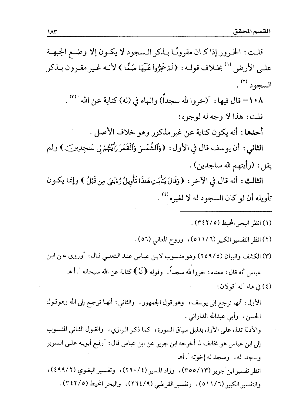 108 - قال فيها: " خروا لله سجداً " والهاء في (له) كناية عن الله ".
