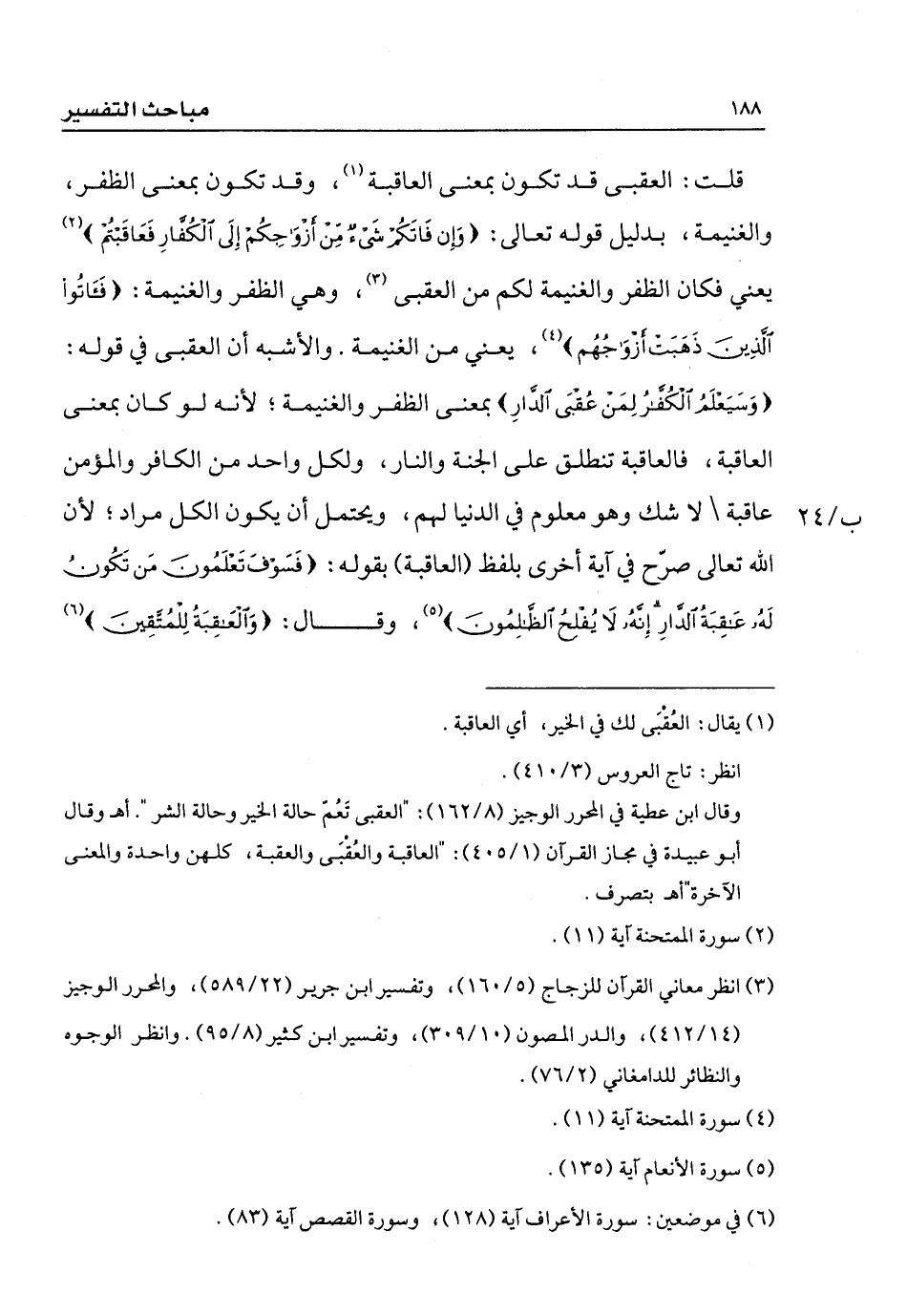 قلت: العقبى قد تكون بمعنى العاقبة، وقد تكون بمعنى الظفر، والغنيمة، بدليل قوله تعالى: {وَإِنْ فَاتَكُمْ شَيْءٌ مِنْ أَزْوَاجِكُمْ إِلَى الْكُفَّارِ فَعَاقَبْتُمْ} يعني فكان الظفر والغنيمة لكم من العقبى، وهي الظفر والغنيمة: {فَآتُوا الَّذِينَ ذَهَبَتْ أَزْوَاجُهُمْ}، يعني من الغنيمة. والأشبه أن العقبى في قوله: {وَسَيَعْلَمُ الْكُفَّارُ لِمَنْ عُقْبَى الدَّارِ} بمعنى الظفر والغنيمة؛ لأنه لو كان بمعنى العاقبة، فالعاقبة تنطلق على الجنة والنار، ولكل واحد من الكافر والمؤمن عاقبة لا شك وهو معلوم في الدنيا لهم، ويحتمل أن يكون الكل مراد؛ لأن الله تعالى صرّح في آية أخرى بلفظ (العاقبة) بقوله: {فَسَوْفَ تَعْلَمُونَ مَنْ تَكُونُ لَهُ عَاقِبَةُ الدَّارِ إِنَّهُ لَا يُفْلِحُ الظَّالِمُونَ}، وقال: {وَالْعَاقِبَةُ لِلْمُتَّقِينَ}