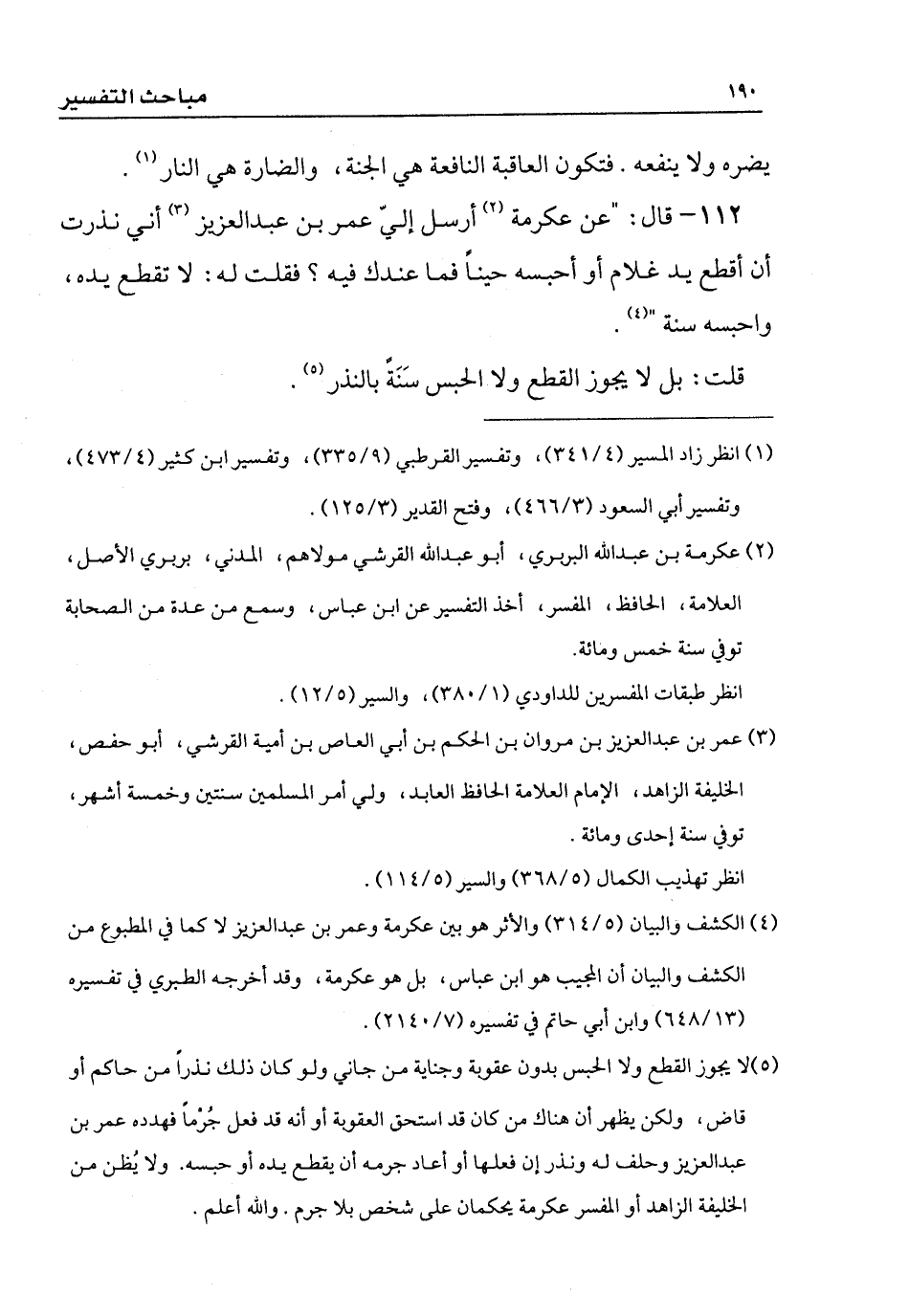 112 - قال: " عن عكرمة أرسل إليّ عمر بن عبد العزيز أني نذرت أن أقطع يد غلام أو أحبسه حيناً فما عندك فيه؟ فقلت له: لا تقطع يده، واحبسه سَنَةً ".
