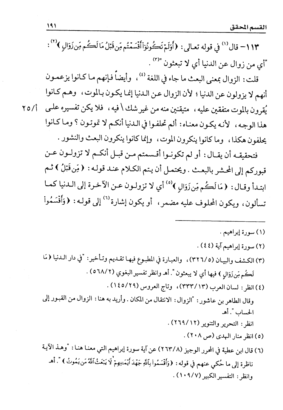 113 - قال في قوله تعالى: {أَوَلَمْ تَكُونُوا أَقْسَمْتُمْ مِنْ قَبْلُ مَا لَكُمْ مِنْ زَوَالٍ}: " أي من زوال عن الدنيا أي لا تبعثون ".