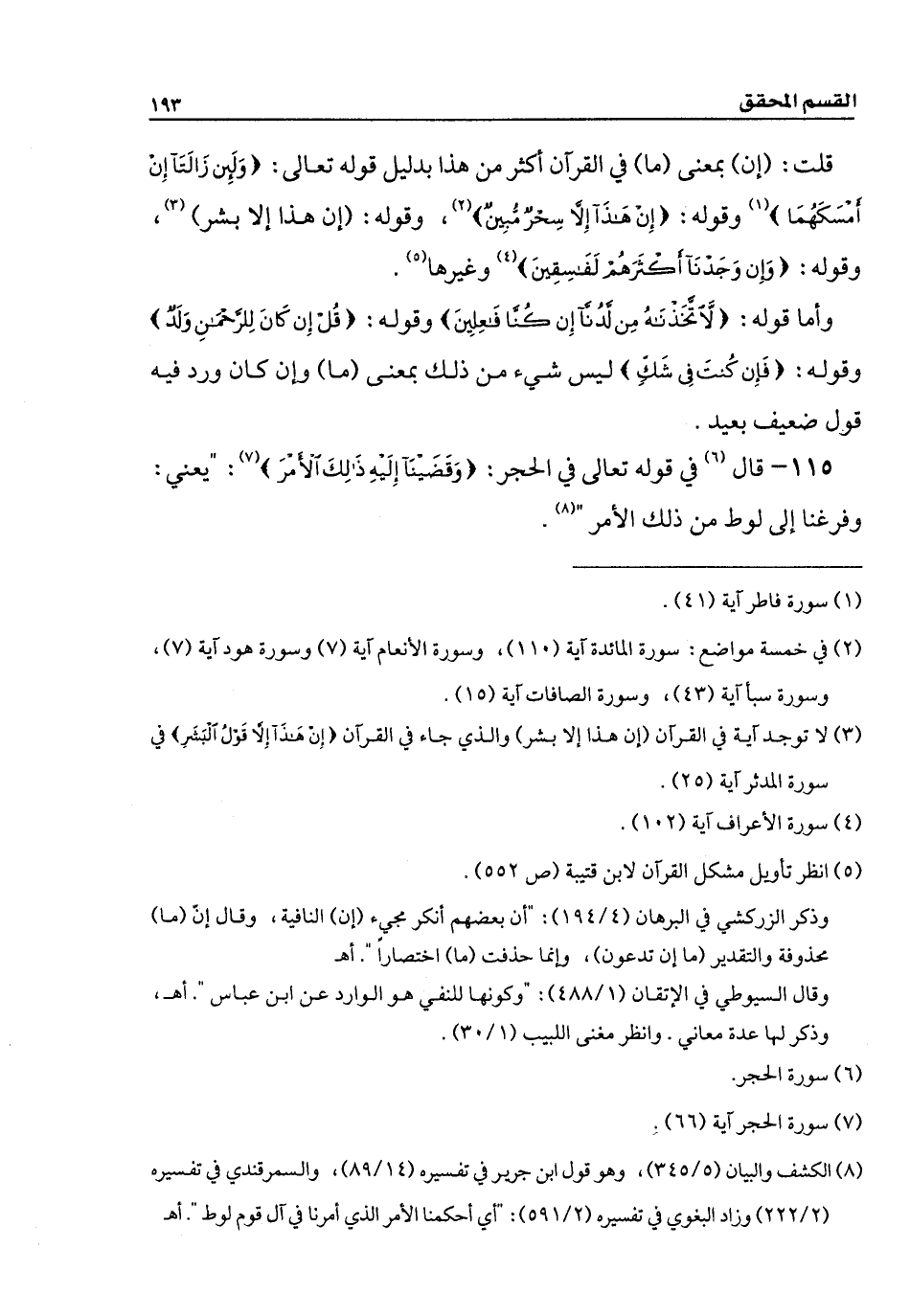 قلت: (إن) بمعنى (ما) في القرآن أكثر من هذا بدليل قوله تعالى: {وَلَئِنْ زَالَتَا إِنْ أَمْسَكَهُمَا} وقوله: {إِنْ هَذَا إِلَّا سِحْرٌ مُبِينٌ}، وقوله: {إِنْ هَذَا إِلَّا قَوْلُ الْبَشَرِ}، وقوله: {وَإِنْ وَجَدْنَا أَكْثَرَهُمْ لَفَاسِقِينَ} وغيرها.