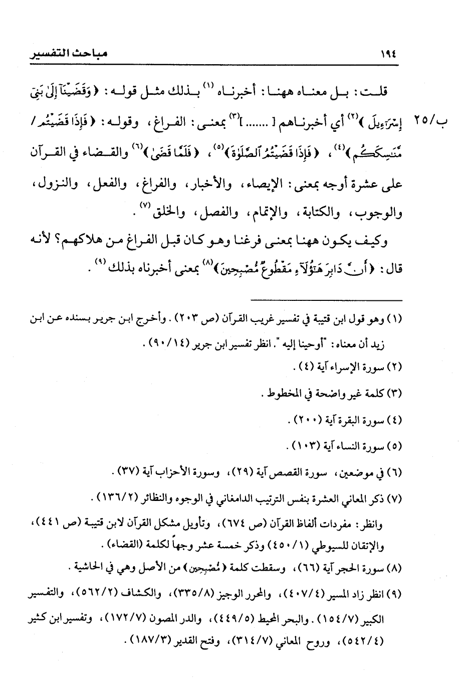 قلت: بل معناه ههنا: أخبرناه بذلك مثل قوله: {وَقَضَيْنَا إِلَى بَنِي إِسْرَائِيلَ} أي أخبرناهم [ ....... ] (¬1) بمعنى: الفراغ، وقوله: {فَإِذَا قَضَيْتُمْ مَنَاسِكَكُمْ}، {فَإِذَا قَضَيْتُمُ الصَّلَاةَ}، {فَلَما قَضَى} والقضاء في القرآن على عشرة أوجه بمعنى: الإيصاء، والإخبار، والفراغ، والفعل، والنزول، والوجوب، والكتابة، والإتمام، والفصل، والخلق.