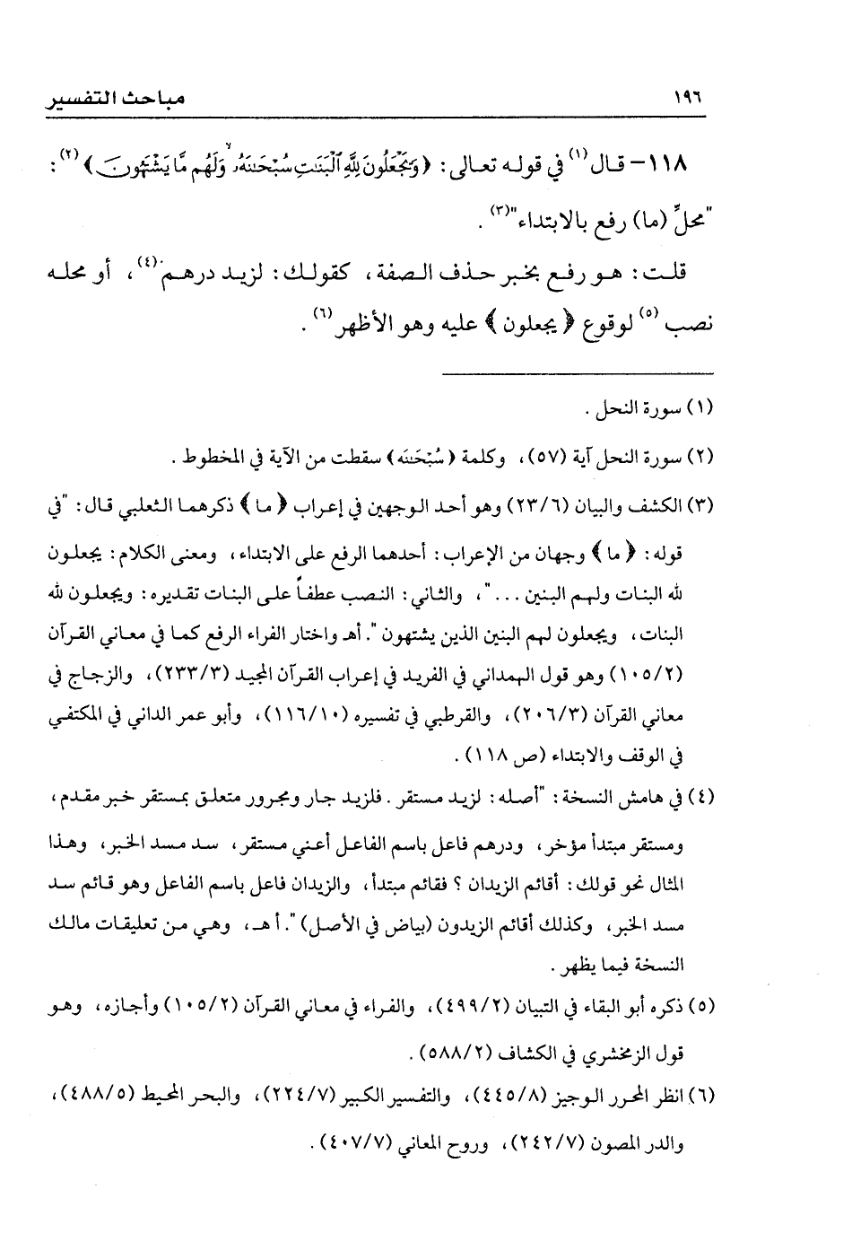 118 - قال في قوله تعالى: {وَيَجْعَلُونَ لِلَّهِ الْبَنَاتِ سُبْحَانَهُ وَلَهُمْ مَا يَشْتَهُونَ}: " محلِّ (ما) رفع بالابتداء ".