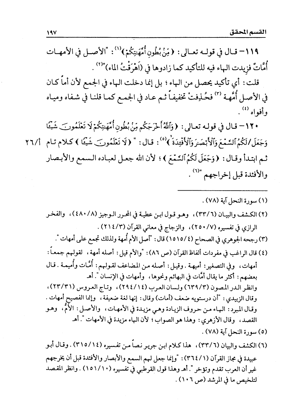 119 - قال في قوله تعالى: {مِنْ بُطُونِ أُمَّهَاتِكُمْ}: " الأصل في الأمهات أُمَّات فزِيدت الهاء فيه للتأكيد كما زادوها في (اَهْرَقْتُ الماء) ".