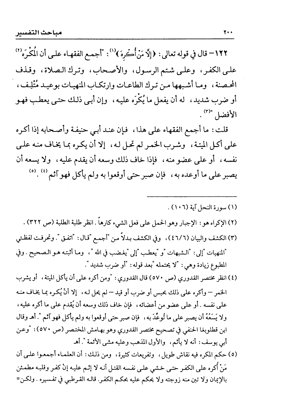 122 - قال في قوله تعالى: {إِلَّا مَنْ أُكْرِهَ وَقَلْبُهُ مُطْمَئِنٌّ بِالْإِيمَانِ}: " أجمع الفقهاء على أن المُكْرَه على الكفر، وعلى شتم الرسول، والأصحاب، وترك الصلاة، وقذف المحصنة، وما أشبهها من ترك الطاعات وارتكاب المنهيات بوعيد مُتْلِف، أو ضرب شديد، له أن يفعل ما يُكْرَه عليه، وإن أبى ذلك حتى يعطب فهو الأفضل ".