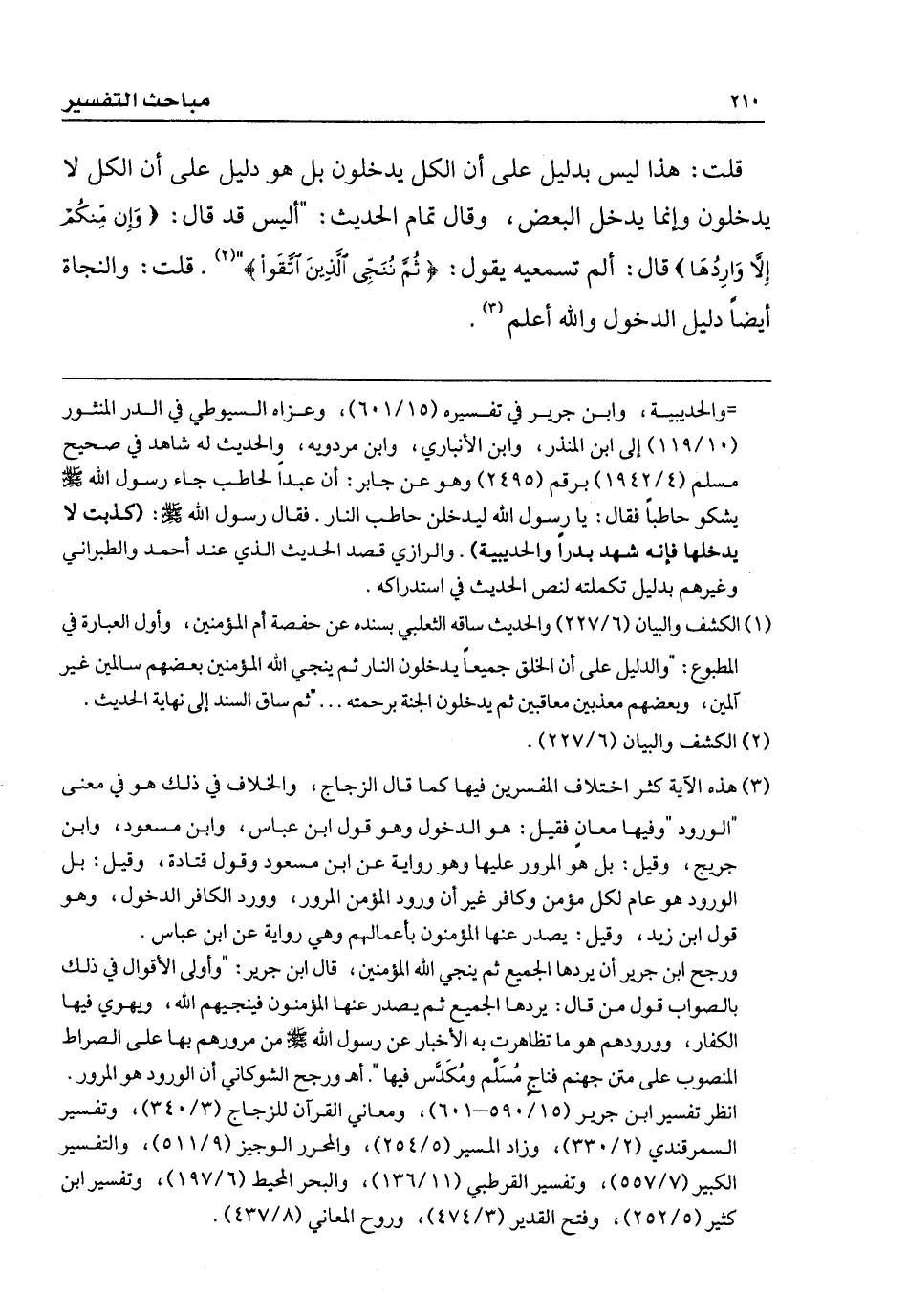 قلت: هذا ليس بدليل على أن الكل يدخلون بل هو دليل على أن الكل لا يدخلون وإنما يدخل البعض، وقال تمام الحديث: " أليس قد قال: {وَإِنْ مِنْكُمْ إِلَّا وَارِدُهَا} قال: ألم تسمعيه يقول: {ثُمَّ نُنَجِّي الَّذِينَ اتَّقَوْا} ". قلت: والنجاة أيضاً دليل الدخول. والله أعلم.