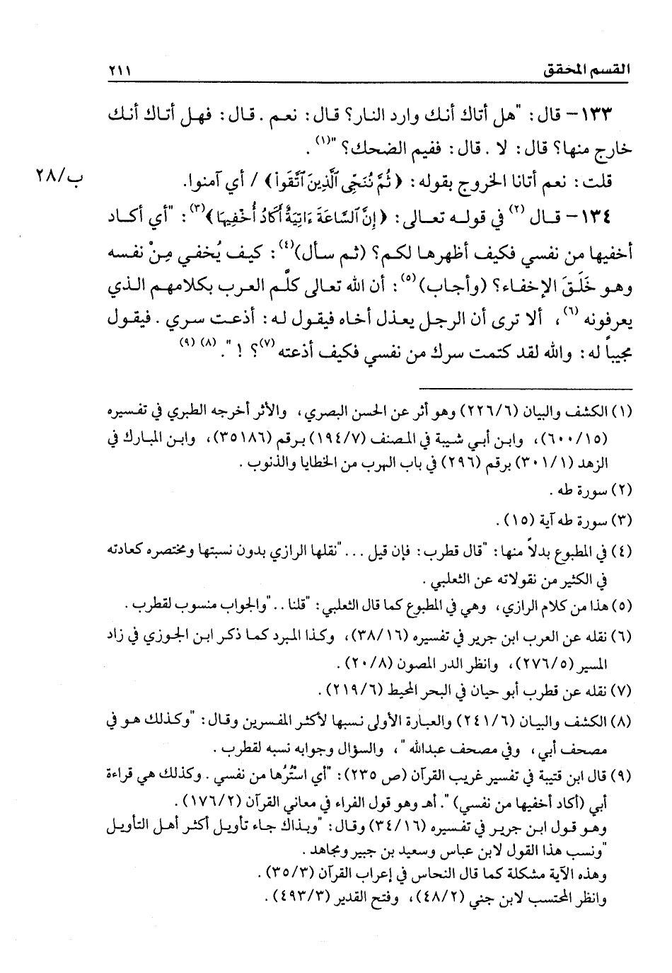 134 - قال في قوله تعالى: {إِنَّ السَّاعَةَ آتِيَةٌ أَكَادُ أُخْفِيهَا}: " أي أكاد أخفيها من نفسي فكيف أظهرها لكم؟ (ثم سأل): كيف يُخفي مِنْ نفسه وهو خَلَقَ الإخفاء؟ (وأجاب): أن الله تعالى كلَّم العرب بكلامهم الذي يعرفونه، ألا ترى أن الرجل يعذل أخاه فيقول له: أذعت سري. فيقول مجيباً له: والله لقد كتمت سرك من نفسي فكيف أذعته؟! ".