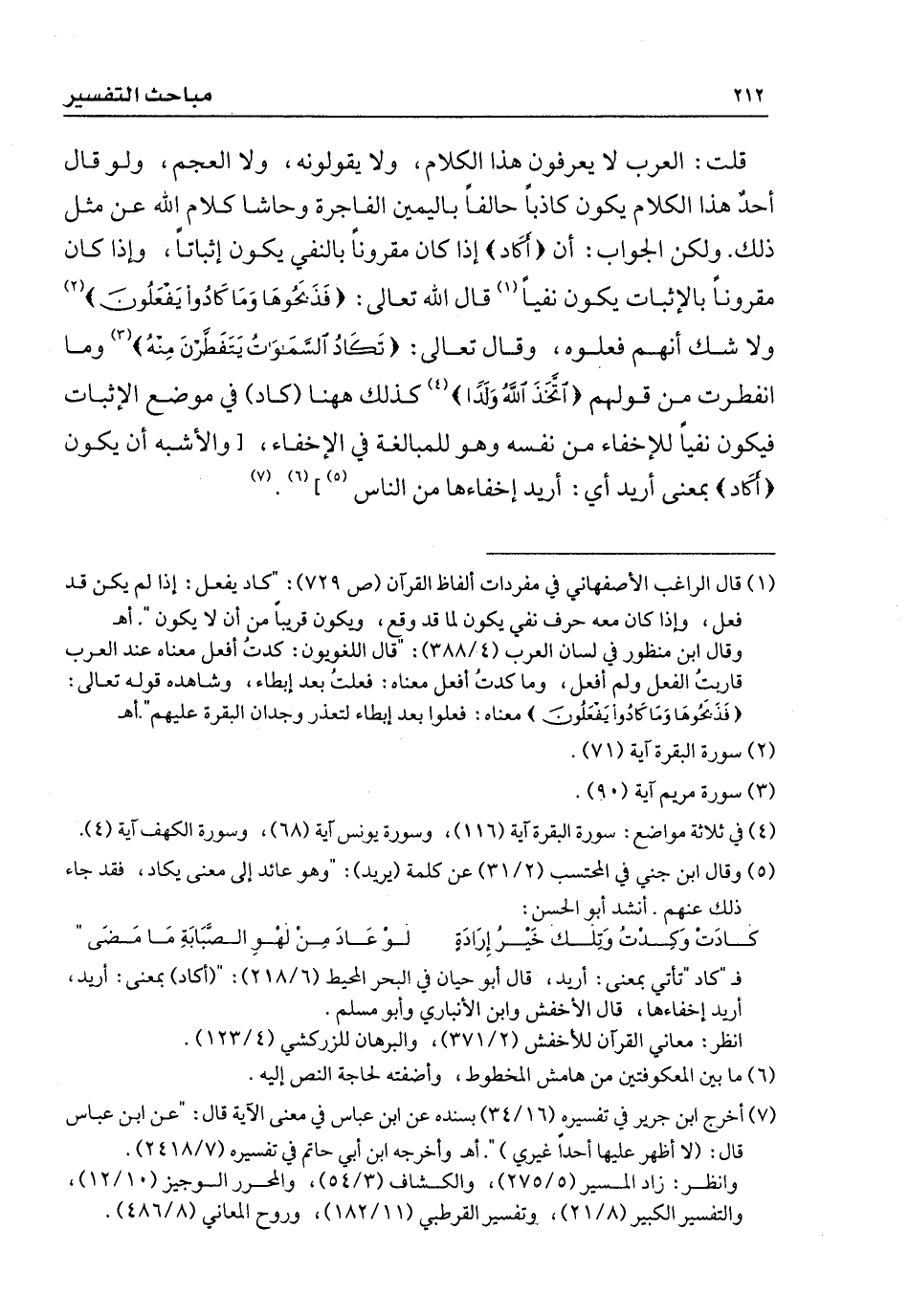 قلت: العرب لا يعرفون هذا الكلام، ولا يقولونه، ولا العجم، ولو قال أحدٌ هذا الكلام يكون كاذباً حالفاً باليمين الفاجرة وحاشا كلام الله عن مثل ذلك. ولكن الجواب: أن {أكاد} إذا كان مقروناً بالنفي يكون إثباتاً، وإذا كان مقروناً بالإثبات يكون نفياً قال الله تعالى: {فَذَبَحُوهَا وَمَا كَادُوا يَفْعَلُونَ} ولا شك أنهم فعلوه، وقال تعالى: {تَكَادُ السَّمَاوَاتُ يَتَفَطَّرْنَ مِنْهُ} وما انفطرت من قولهم {اتَّخَذَ اللَّهُ وَلَدًا} كذلك ههنا (كاد) في موضع الإثبات فيكون نفياً للإخفاء من نفسه وهو للمبالغة في الإخفاء، والأشبه أن يكون {أكاد} بمعنى أريد أي: أريد إخفاءها من الناس.