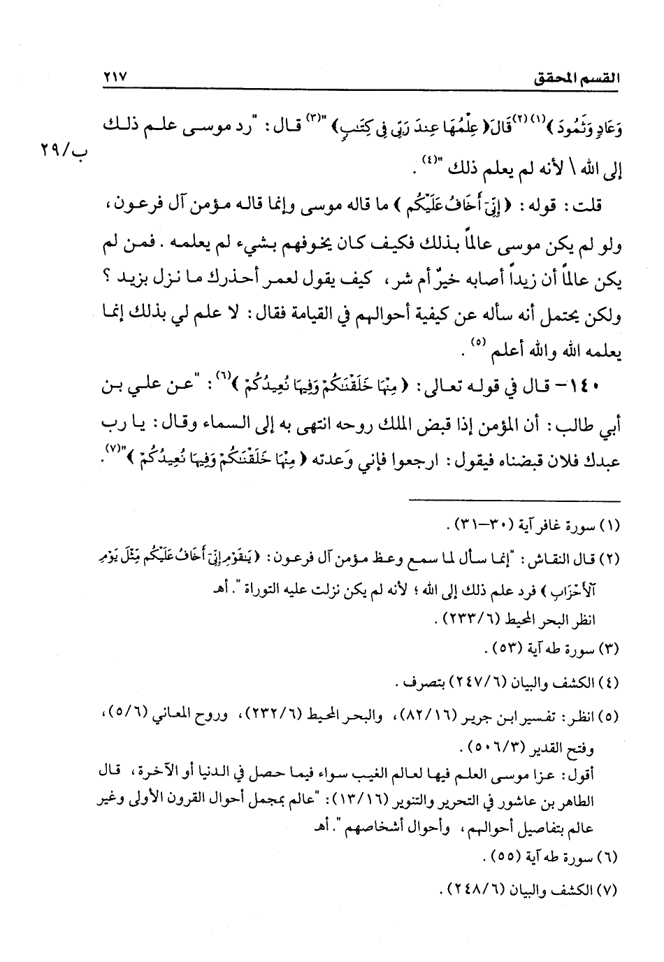 قلت: قوله: {إِنِّي أَخَافُ عَلَيْكُمْ} ما قاله موسى وإنما قاله مؤمن آل فرعون، ولو لم يكن موسى عالماً بذلك فكيف كان يخوفهم بشيء لم يعلمه. فمن لم يكن عالماً أن زيداً أصابه خير أم شر، كيف يقول لعمر أحذرك ما نزل بزيد؟ ولكن يحتمل أنه سأله عن كيفية أحوالهم في القيامة فقال: لا علم لي بذلك إنما يعلمه الله والله أعلم.