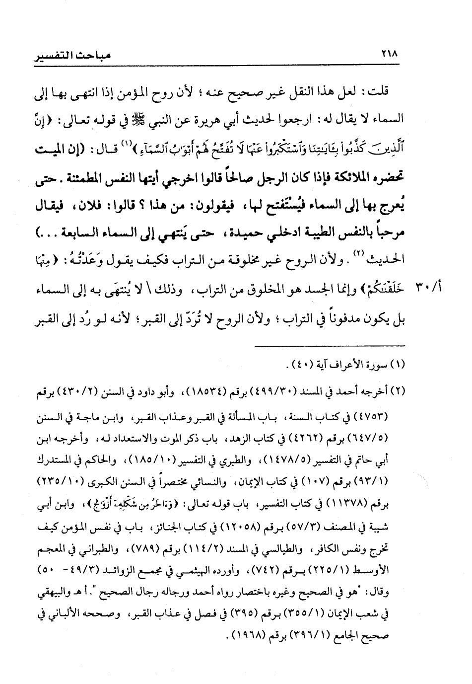 قلت: لعل هذا النقل غير صحيح عنه؛ لأن روح المؤمن إذا انتهى بها إلى السماء لا يقال له: ارجعوا لحديث أبي هريرة عن النبي - صلى الله عليه وسلم - في قوله تعالى: {إِنَّ الَّذِينَ كَذَّبُوا بِآيَاتِنَا وَاسْتَكْبَرُوا عَنْهَا لَا تُفَتَّحُ لَهُمْ أَبْوَابُ السَّمَاءِ} قال: (إن الميت تحضره الملائكة فإذا كان الرجل صالحاً قالوا اخرجي أيتها النفس المطمئنة. حتى يعرج بها إلى السماء فيستفتح لها، فيقولون: من هذا؟ قالوا: فلان، فيقال مرحباً بالنفس الطيبة ادخلي حميدة، حتى يَنتهي إلى السماء السابعة ... ) الحديث. ولأن الروح غير مخلوقة من التراب فكيف يقول وَعَدْتهُ: {مِنْهَا خَلَقْنَاكُمْ} وإنما الجسد هو المخلوق من التراب، وذلك لا يُنتهَى به إلى السماء بل يكون مدفوناً في التراب؛ ولأن الروح لا ترَدُّ إلى القبر؛ لأنه لو رُد إلى القبر