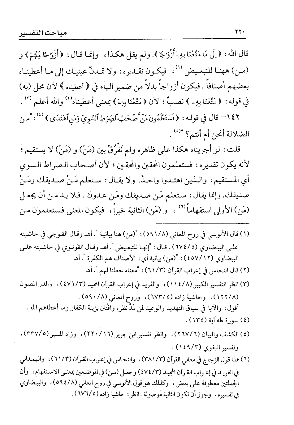 قال الله: {إِلَى مَا مَتَّعْنَا بِهِ أَزْوَاجًا}. ولم يقل هكذا، وإنما قال: {أَزْوَاجًا مِنْهُمْ} و (من) ههنا للتبعيض، فيكون تقديره: ولا تمدنَّ عينيك إلى ما أعطيناه بعضهم أصنافاً. فيكون أزواجاً بدلاً من ضمير الهاء في {أعطيناه} لأن محل (به) في قوله: {مَتَّعْنَا بِهِ} نصبٌ؛ لأن {مَتَّعْنَا بِهِ} بمعنى أعطيناه والله أعلم.