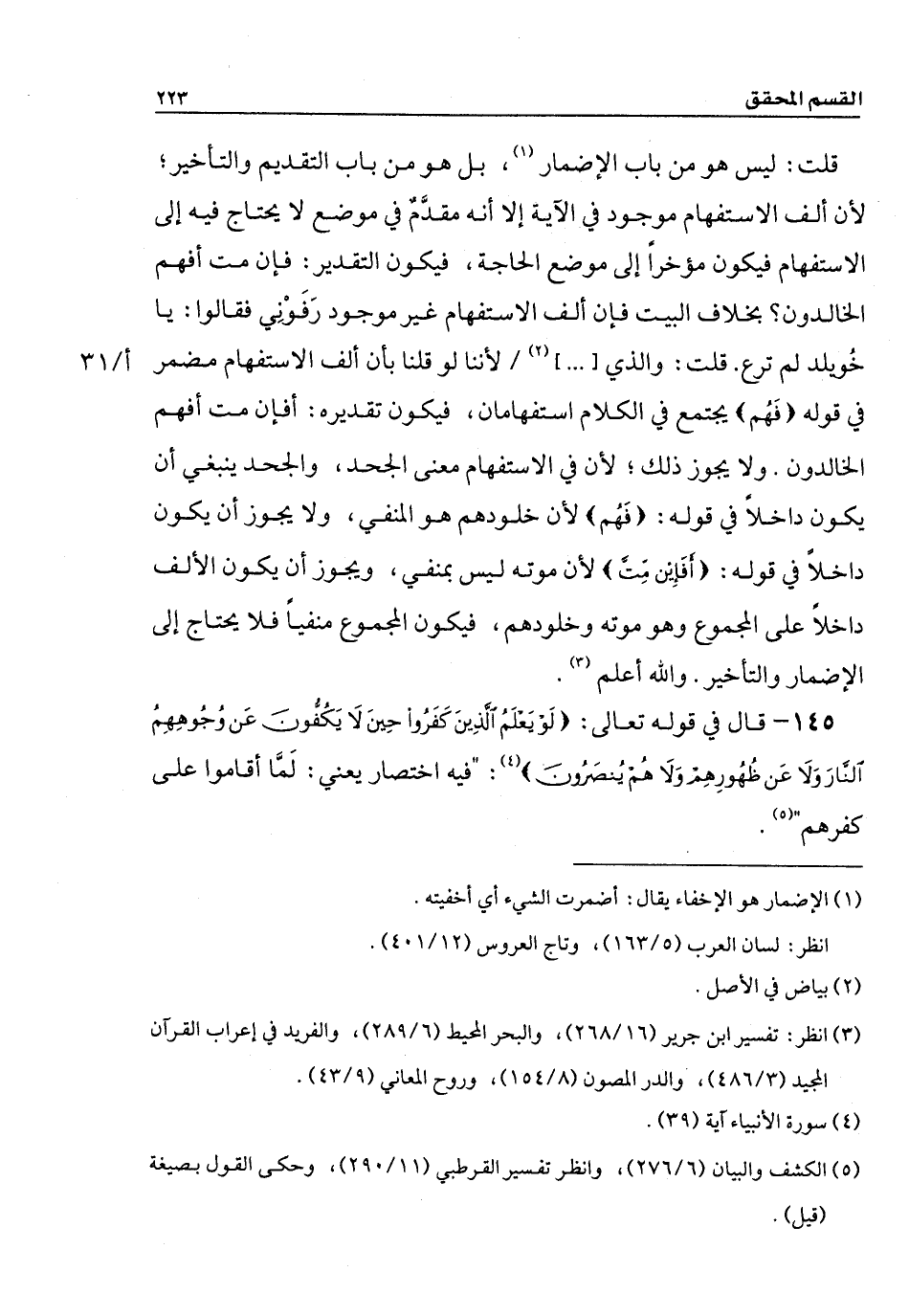 145 - قال في قوله تعالى: {لَوْ يَعْلَمُ الَّذِينَ كَفَرُوا حِينَ لَا يَكُفُّونَ عَنْ وُجُوهِهِمُ النَّارَ وَلَا عَنْ ظُهُورِهِمْ وَلَا هُمْ يُنْصَرُونَ}: " فيه اختصار يعني: لَمَّا أقاموا على كفرهم ".
