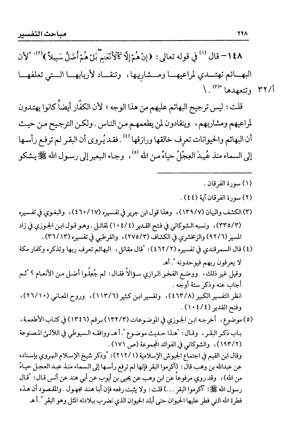 148 - قال في قوله تعالى: {إِنْ هُمْ إِلَّا كَالْأَنْعَامِ بَلْ هُمْ أَضَلُّ سَبِيلًا}: " لأن البهائم تهتدي لمراعيها ومشارِبها، وتنقاد لأربابها التي تعلفها وتتعهدها ".