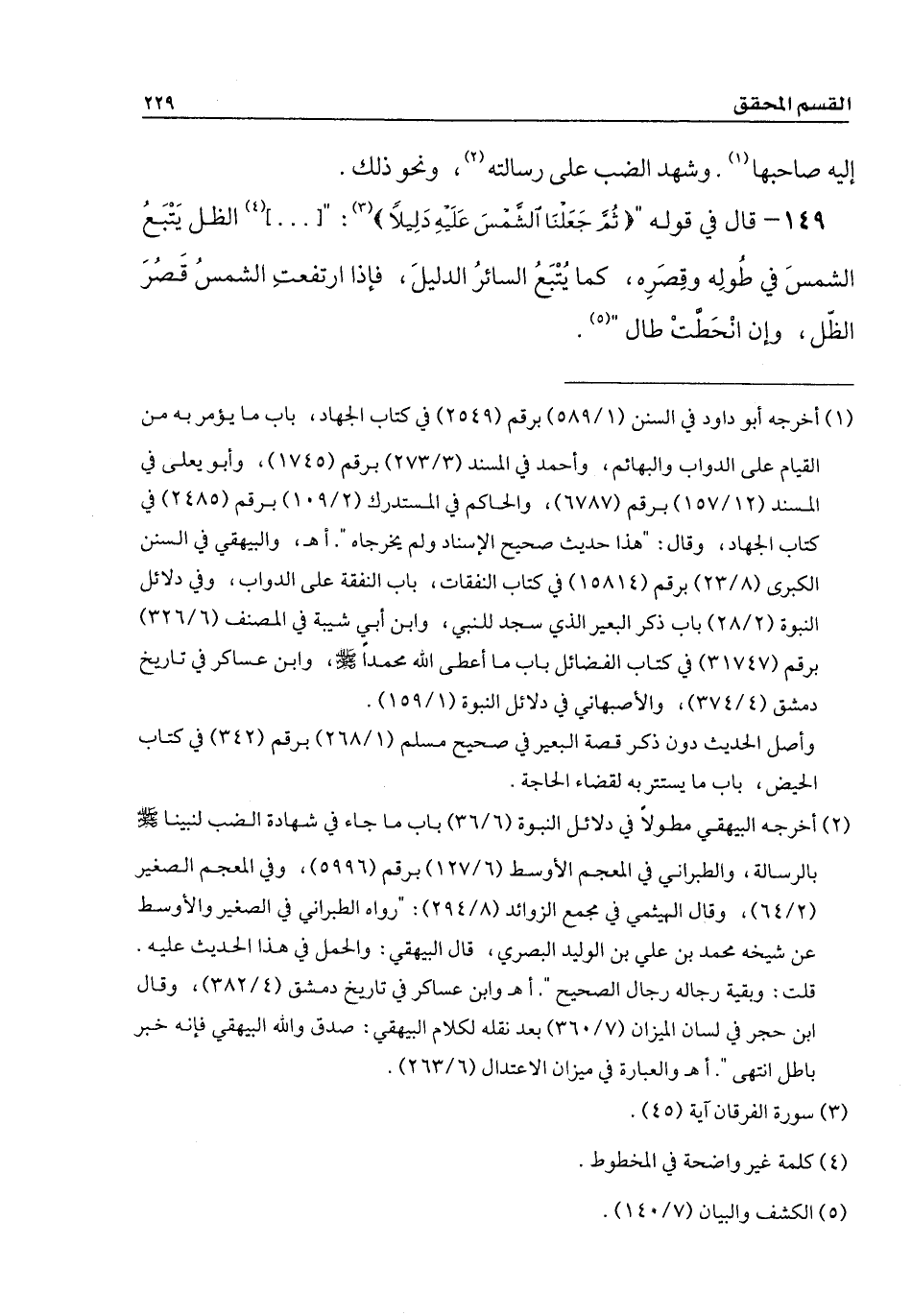 149 - قال في قوله {ثُمَّ جَعَلْنَا الشَّمْسَ عَلَيْهِ دَلِيلًا}: " الظل يَتْبَعُ الشمسَ في طُولِه وقِصَرِه، كما يُتْبَعُ السائرُ الدليلَ، فإذا ارتفعت الشمسُ قَصُرَ الظّل، وإن انْحَطتْ طال ".