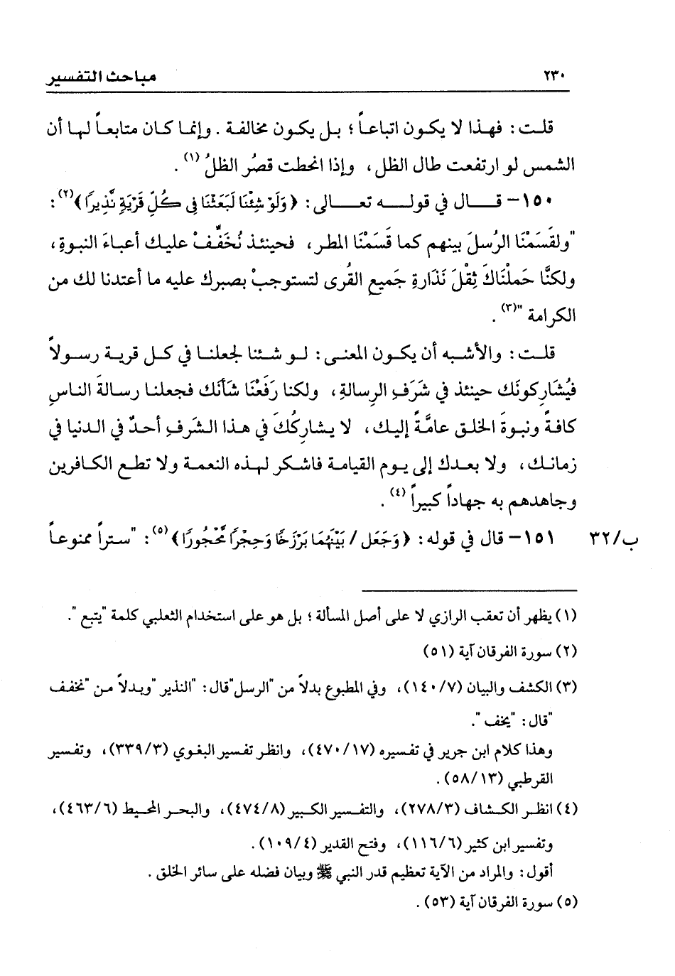 150 - قال في قوله تعالى: {وَلَوْ شِئْنَا لَبَعَثْنَا فِي كُلِّ قَرْيَةٍ نَذِيرًا}: " ولقَسَمْنَا الرُسل بينهم كما قَسَمْنَا المطر، فحينئذ نُخَفف عليك أعباءَ النبوةِ، ولكنا حَملْنَاكَ ثِقلَ نَذَارةِ جَميع القُرى لتستوجبْ بصبرك عليه ما أعتدنا لك من الكرامة ".