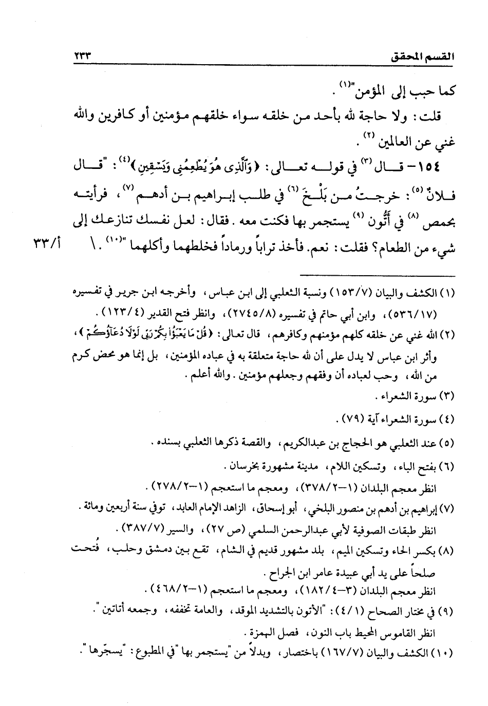 154 - قال في قوله تعالى: {وَالَّذِي هُوَ يُطْعِمُنِي وَيَسْقِينِ}: قال فلان: خرجتُ من بَلْخَ في طلب إبراهيم بن أدهم، فرأيته بحمص في أَتُّون يستجمر بها فكنت معه. فقال: لعل نفسك تنازعك إلى شيء من الطعام؟ فقلت: نعم. فأخذ تراباً ورماداً فخلطهما وأكلهما ".