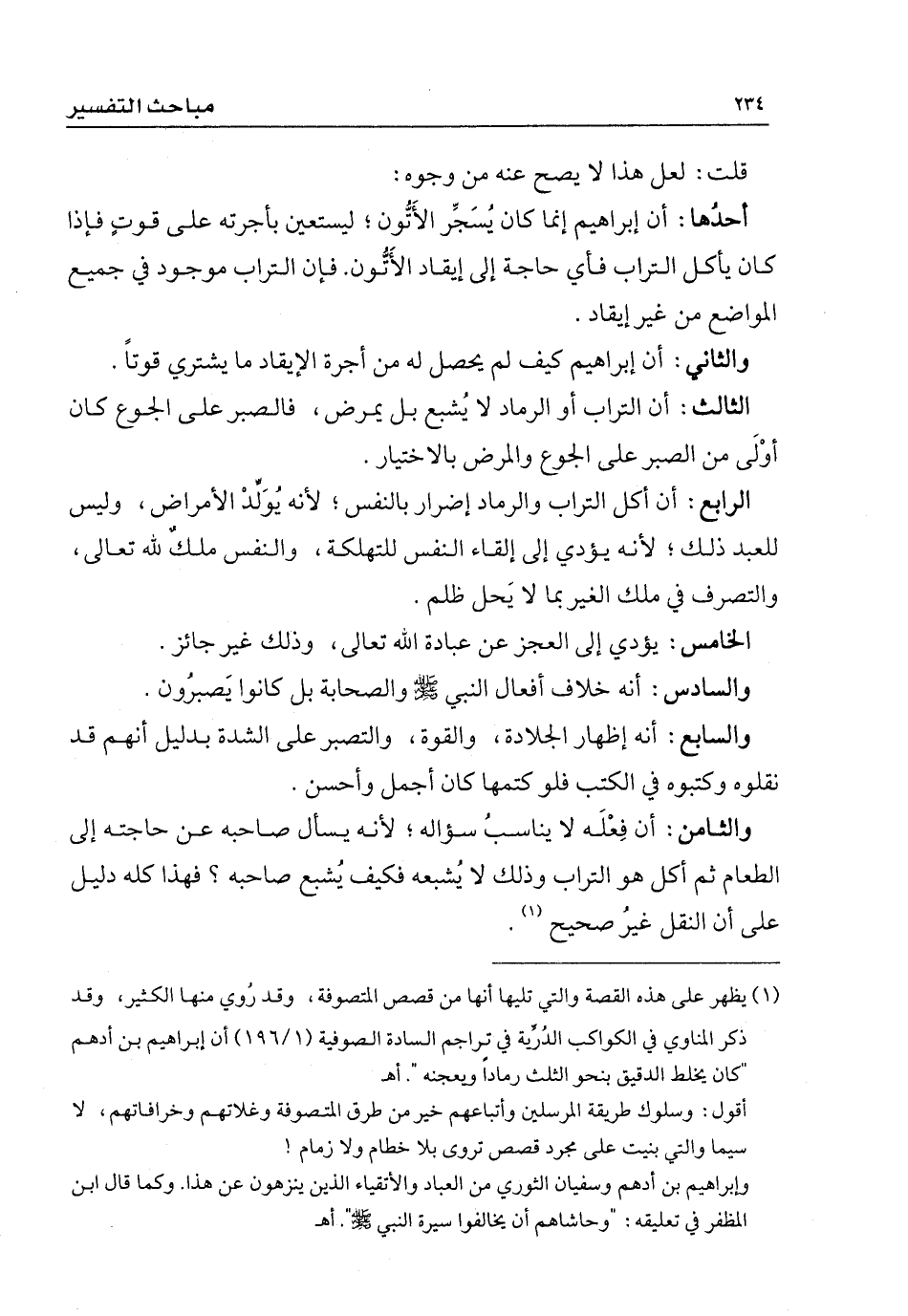 أحدُها: أن إبراهيم إنما كان يُسَجِّر الأتُّون؛ ليستعين بأجرته على قوتٍ فإذا كان يأكل التراب فأي حاجة إلى إيقاد الأتُّون. فإن التراب موجود في جميع المواضع من غير إيقاد.