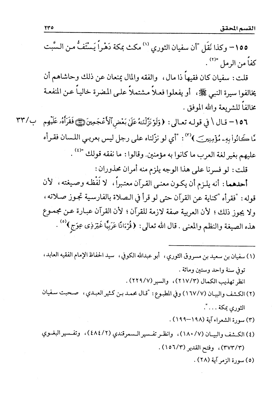 156 - قال في قوله تعالى: {وَلَوْ نَزَّلْنَاهُ عَلَى بَعْضِ الْأَعْجَمِينَ (198) فَقَرَأَهُ عَلَيْهِمْ مَا كَانُوا بِهِ مُؤْمِنِينَ}: " أي لو نزلناه على رجل ليس بعربي اللسان فقرأه عليهم بغير لغة العرب ما كانوا به مؤمنين. وقالوا: ما نفقه قولك ".
